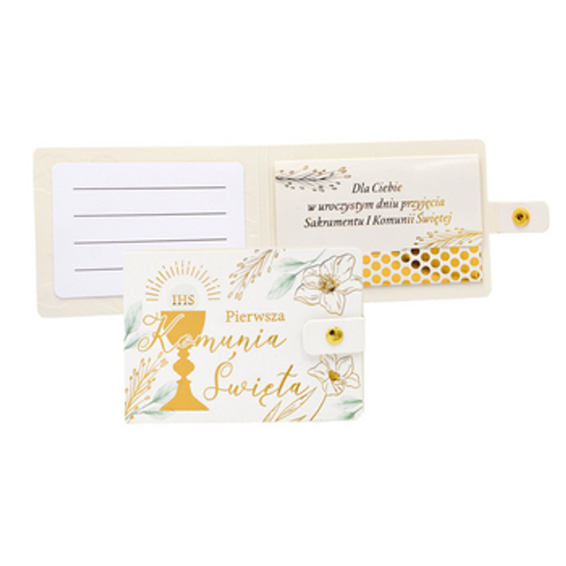 Portfeliki z życzeniami to alternatywa dla tradycyjnych kartek, są wyjątkowym sposobem na podarowanie bliskiej osobie banknotu. Portfeliki są kolorowe i uszlachetnione metalizowaną folią hot-stamp, oraz są wyposażone w zamknięcie na zatrzask, co umożliwia ich wielokrotne otwieranie i zamykanie - jak w prawdziwym portfelu. Portfeliki zawierają niebanalne teksty oraz życzenia w środku. Specyfikacja: wymiary: 11 x 8 cm (po złożeniu) wnętrze: życzenia w środku waga: 13 g okazja: Komunia Święta