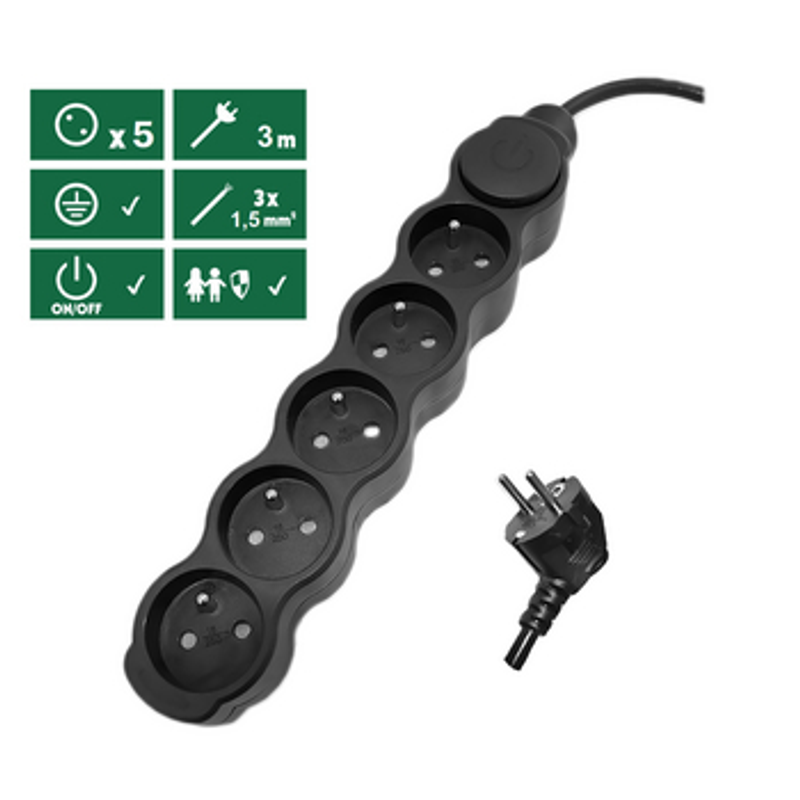 Przedłużacz 5 gniazd z uziemieniem i wyłącznikiem o przekroju 1,5mm2 3m czarny