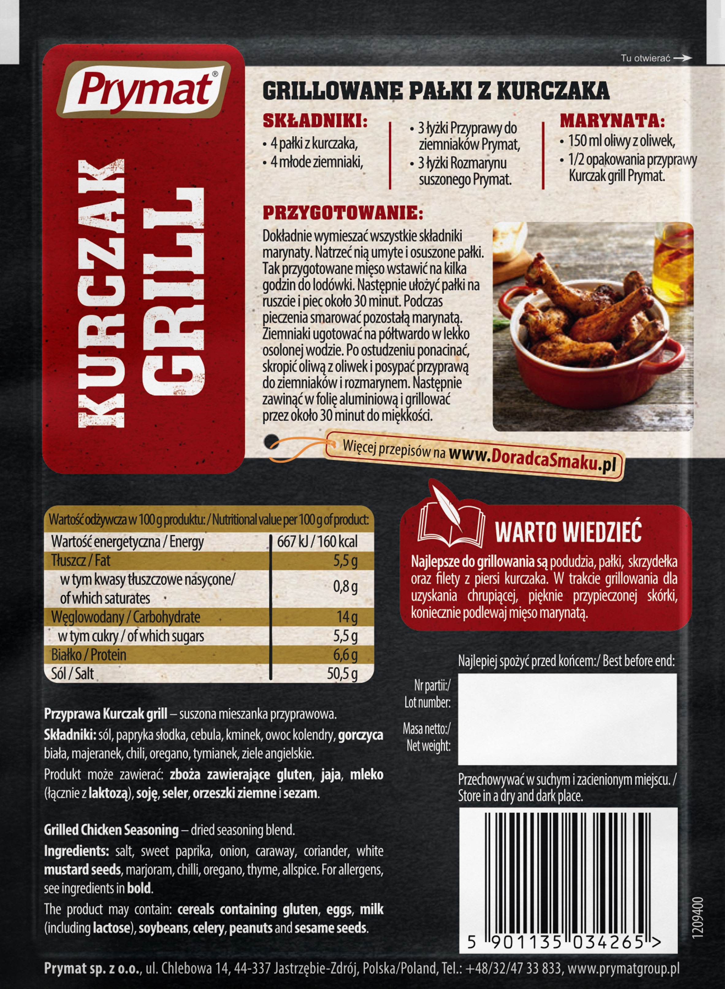Pierś z kurczaka na grilla? A może nóżka, skrzydełko lub szaszłyk? Niezależnie od tego co wrzucisz na ruszt, smak drobiu znakomicie podkreśli przyprawa do kurczaka z grillą Prymat!