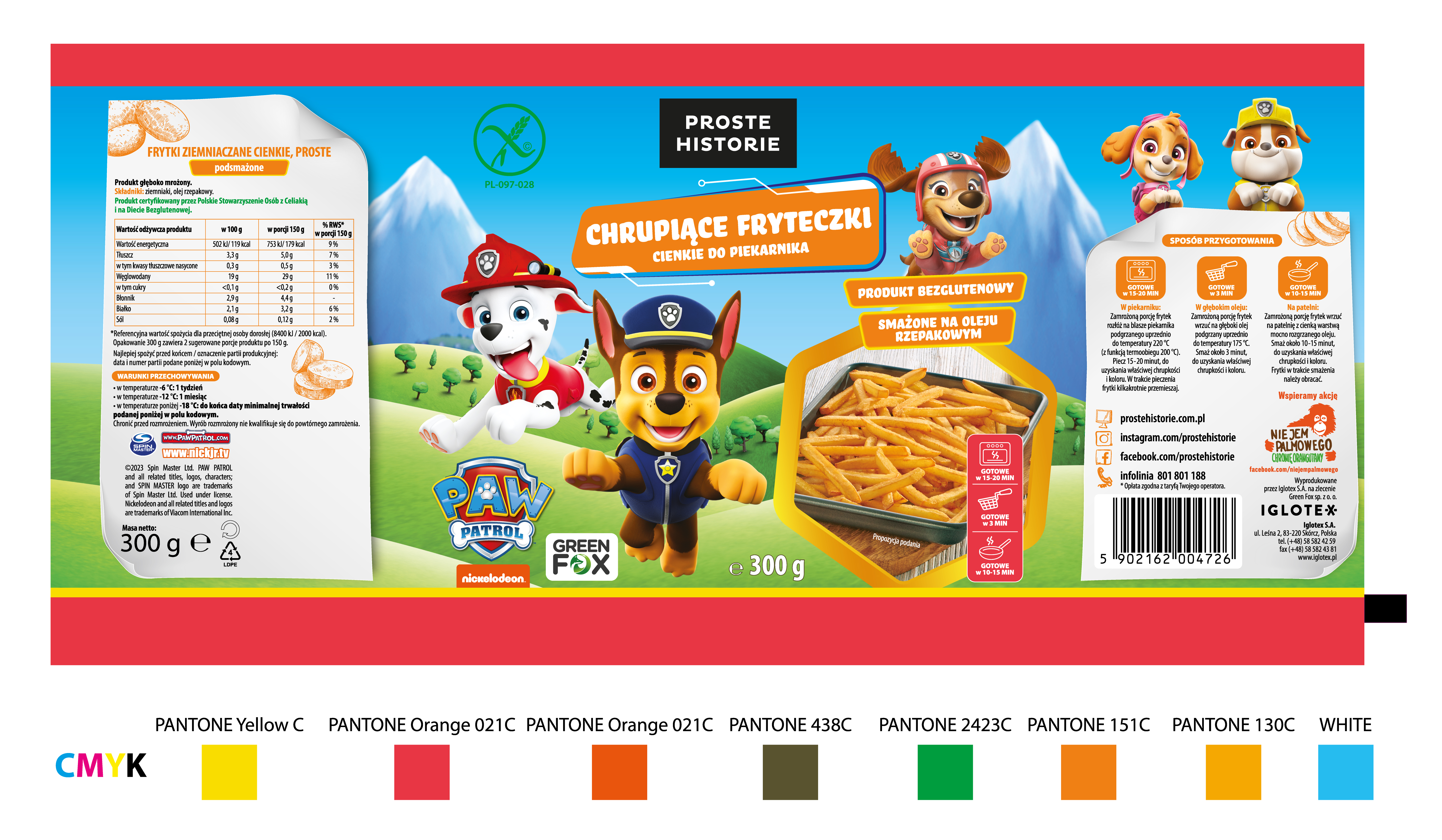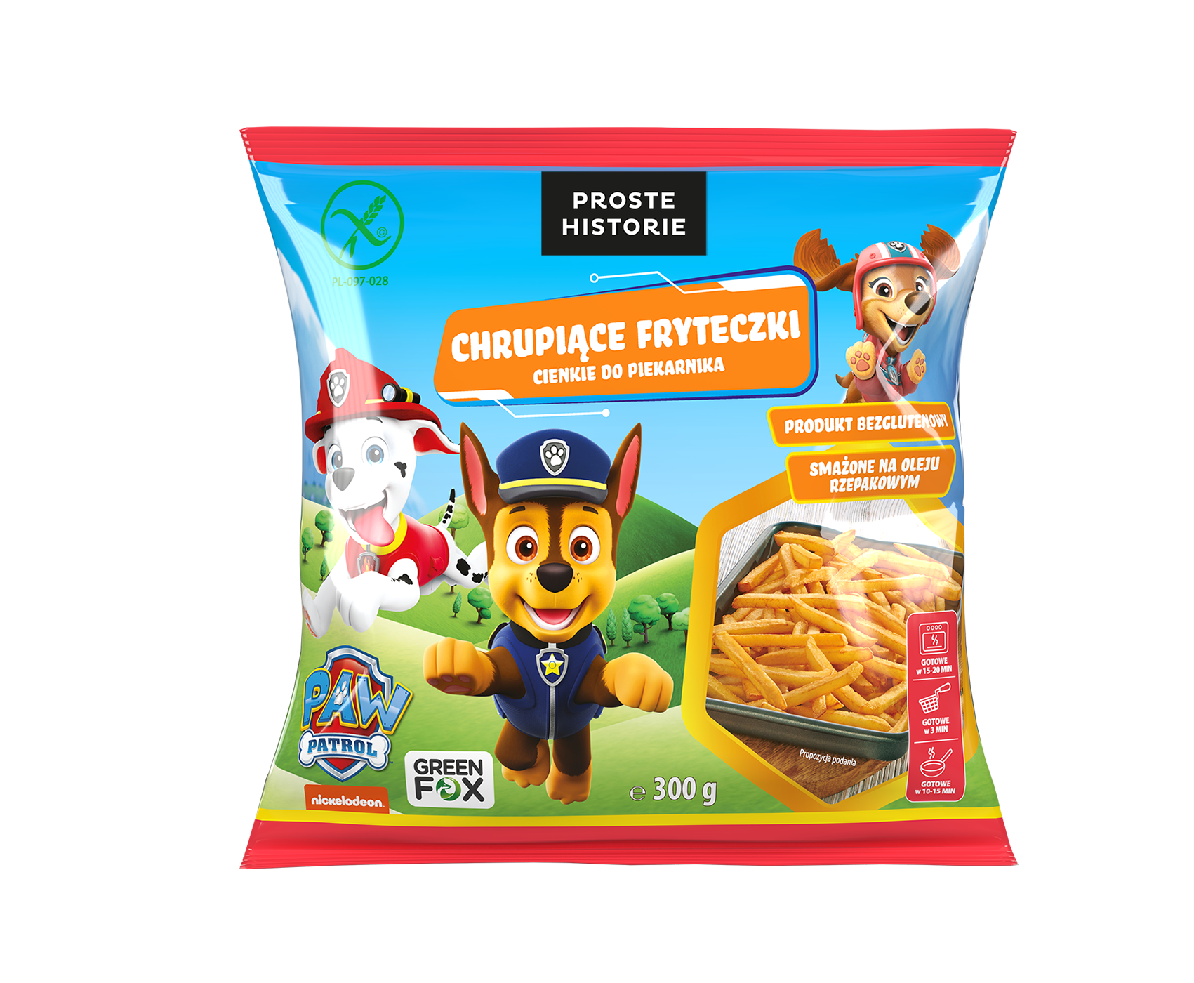 Ulubione danie dzieci to … frytki. Wie to mama, wie to tata. Bohaterowie Psi Patrol ruszają zatem do akcji i serwują ulubione dziecięce przysmaki. Cienkie fryteczki podsmażane są na oleju rzepakowym i można przyrządzić je w piekarniku. Posiadają, krótki, prosty skład, a także oficjalny certyfikat produktu bezglutenowego. To idealny dodatek do dań, które pokocha każdy mały fan. Miłego chrupania!.