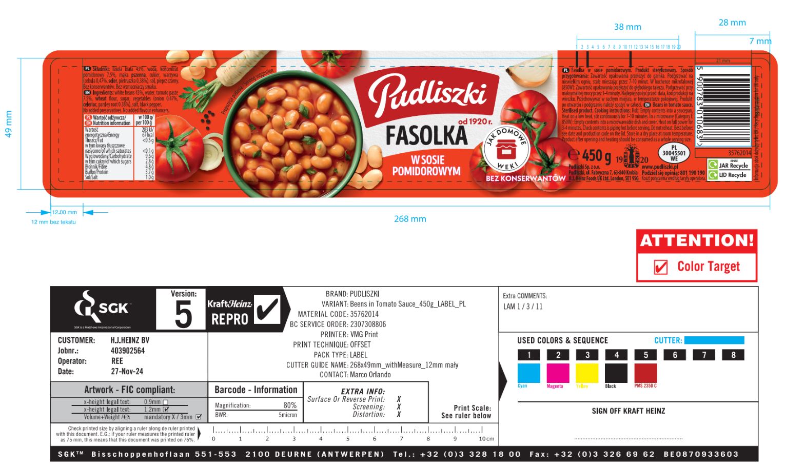 | Składniki | Fasola biała 43%, woda, koncentrat pomidorowy 7,5%, mąka pszenna, cukier, warzywa (cebula 0,47%, seler, pietruszka 0,38%), sól, pieprz czarny. |