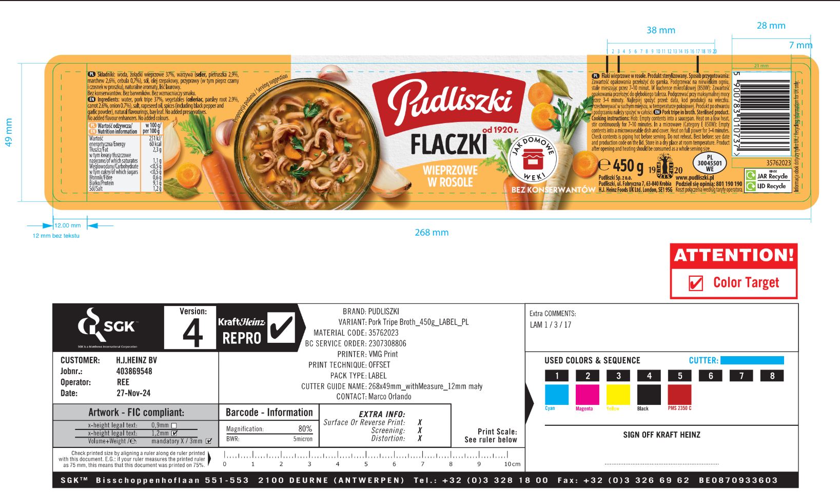 | Składniki | Woda, żołądki wieprzowe 37%, warzywa (seler, pietruszka 2,9%, marchew 2,6%, cebula 0,7%), sól, olej rzepakowy, przyprawy (w tym pieprz czarny i czosnek w proszku), aromaty, liść laurowy. |