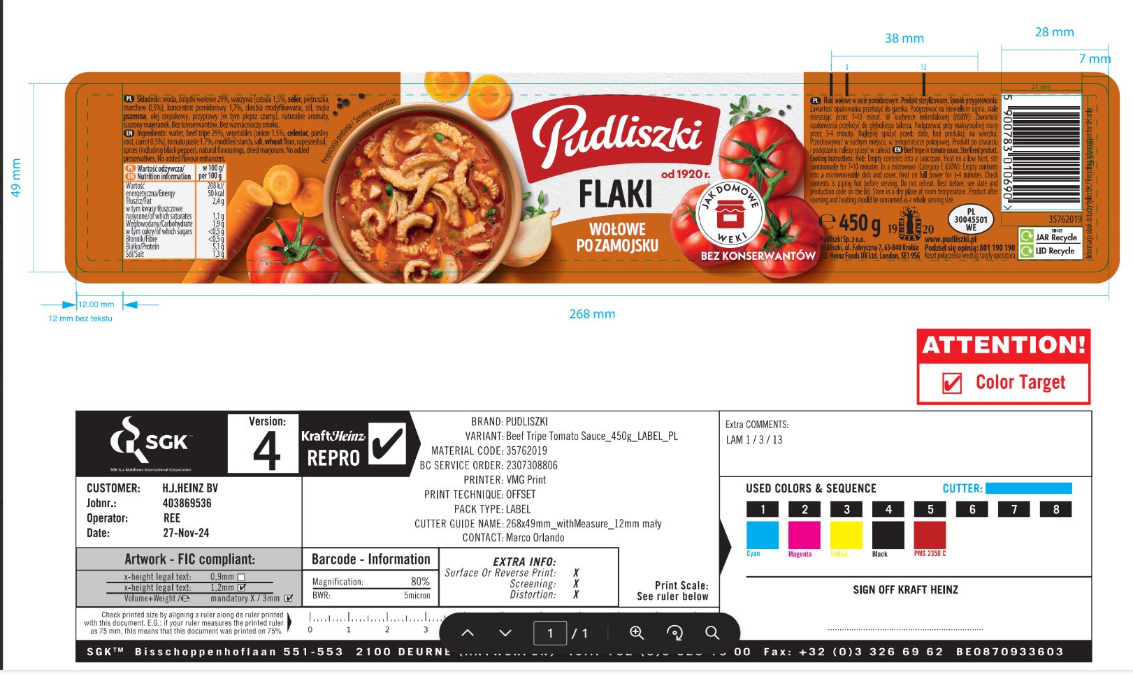 | Składniki | Woda, żołądki wołowe 29%, warzywa (cebula 1,5%, seler, pietruszka, marchew 0,5%), koncentrat pomidorowy 1,7%, skrobia modyfikowana, sól, mąka pszenna, olej rzepakowy, przyprawy (w tym pieprz czarny), aromaty, suszony majeranek. |