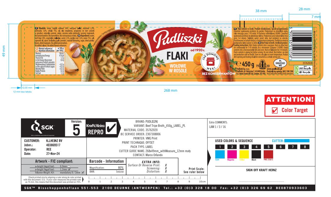 | Składniki | Woda, żołądki wołowe 34%, warzywa (seler, marchew 2,3%, pietruszka 1,6%, cebula 1%), sól, olej rzepakowy, przyprawy (w tym czosnek w proszku), aromat, cukier, suszona natka pietruszki, suszony majeranek |
