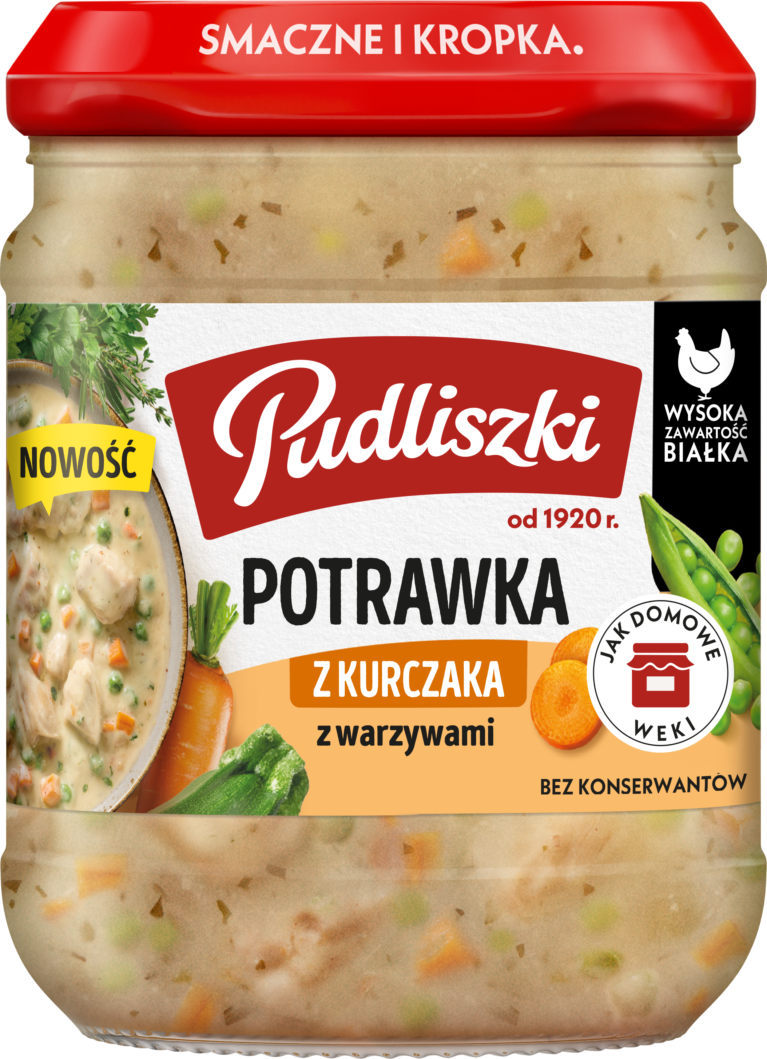 | Składniki | Składniki: woda, mięso z uda kurczaka 25%, warzywa 17% (cebula 6,9%, cukinia 2,7%, marchew 2,7%, pietruszka, groszek 2%, seler), śmietanka 4,1% (z mleka), skrobia modykowana, olej rzepakowy, cukier, sól, zioła 0,2%, przyprawy. bez wzmacniaczy smaku. bez barwników. |