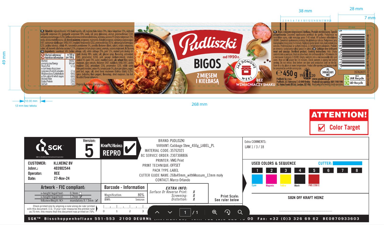 | Składniki | Kapusta kwaszona 34% (kapusta biała, sól), kapusta biała świeża 29%, mięso wieprzowe 12%, podgardle wieprzowe wędzone 6% [podgardle wieprzowe 90%, woda, sól, syrop glukozowy, aromat, przeciwutleniacz (e301), substancja konserwująca (e250)], kiełbasa 5% [mięso wieprzowe 73%, woda, skrobia modyfikowana, sól, błonnik pszenny bezglutenowy, przyprawy i ekstrakty przypraw, substancja zagęszczająca (e407), stabilizatory (e450, e451), regulator kwasowości (e262), przeciwutleniacz (e316), substancja konserwująca (e250), osłonka jadalna (jelito wieprzowe)], cebula 4%, koncentrat pomidorowy 3%, powidła śliwkowe (śliwki, cukier), smalec wieprzowy, cukier, sól, borowik szlachetny suszony 0,25%, przyprawy, aromat, aromat, czosnek suszony, majeranek. |