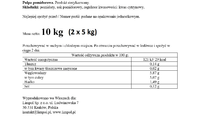 | Składniki | Pomidory, sok pomidorowy, regulator kwasowości: kwas cytrynowy |