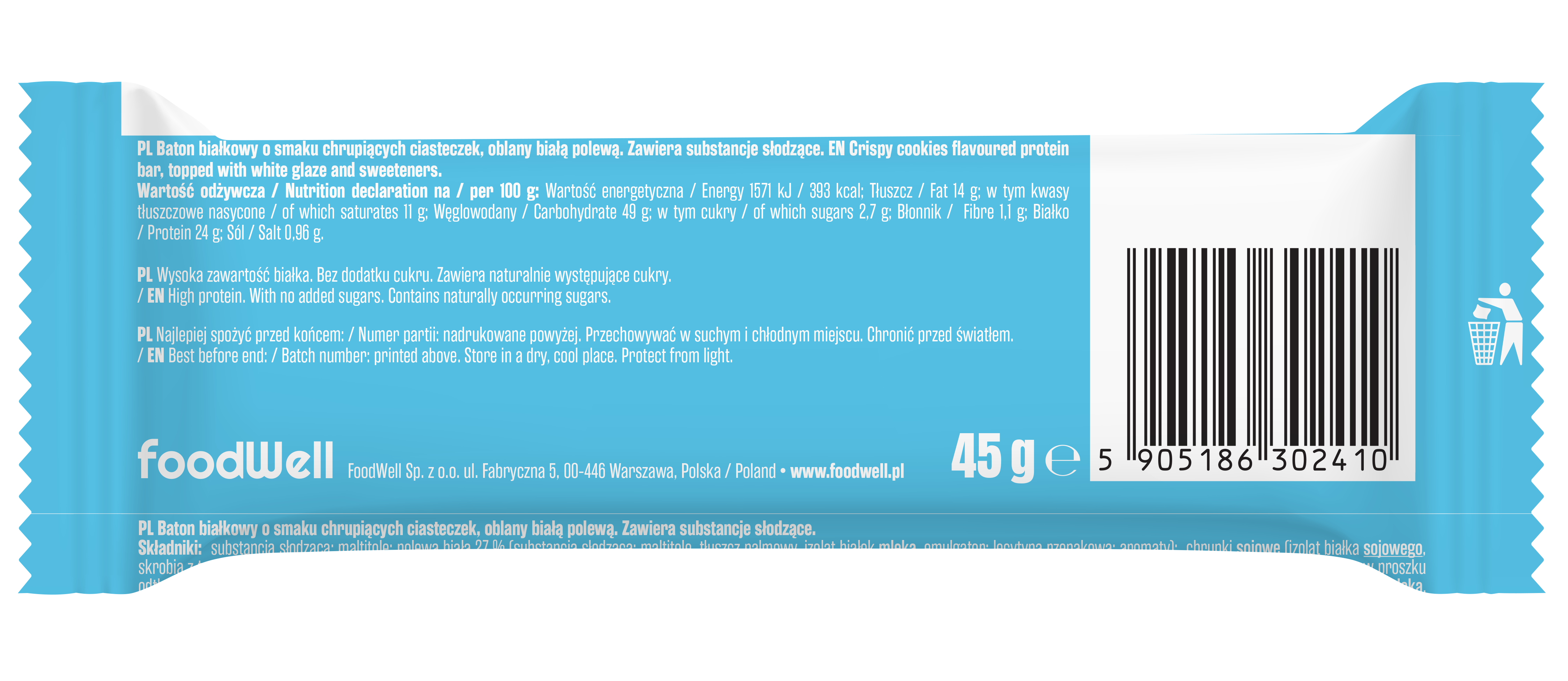 Baton białkowy o smaku chrupiących ciasteczek z baobabem, oblany polewą. Zawiera substancje słodzące.