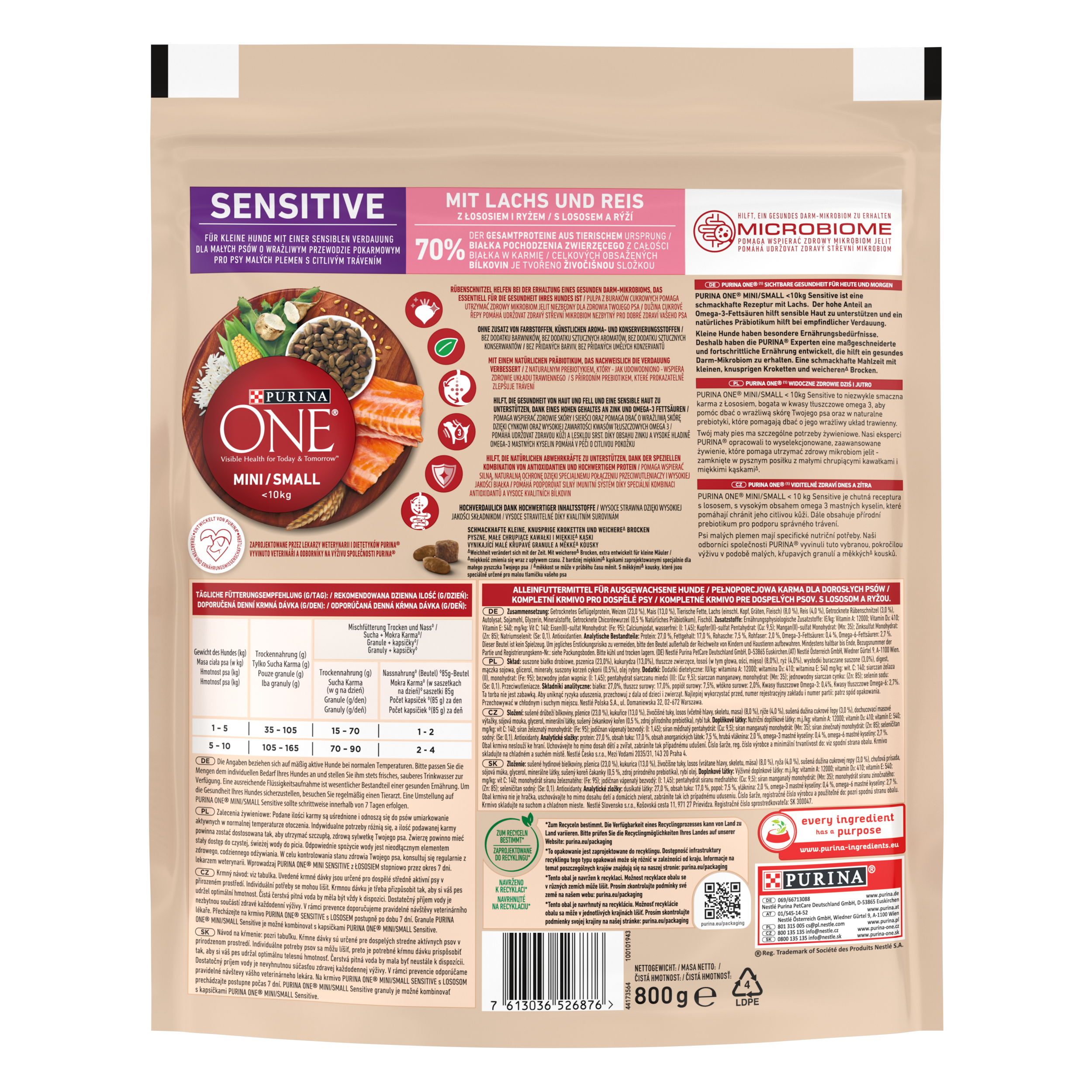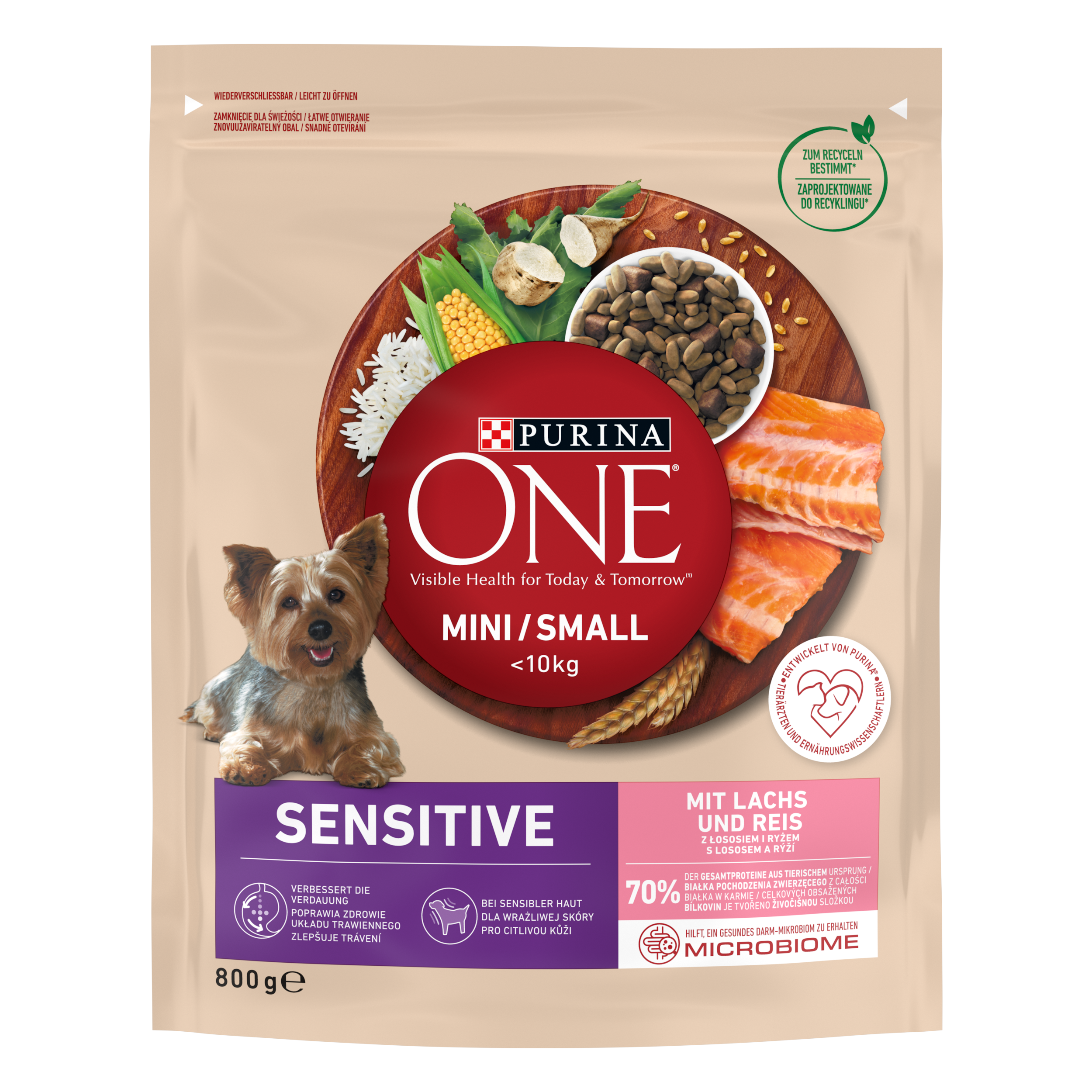 Purina ONE Mini <10 kg Sensitive to niezwykle smaczna karma z Łososiem, bogata w kwasy tłuszczowe Omega 3, aby pomóc dbać o wrażliwą skórę Twojego psa oraz w prebiotyki, które pomagają dbać o jego wrażliwy układ trawienny.