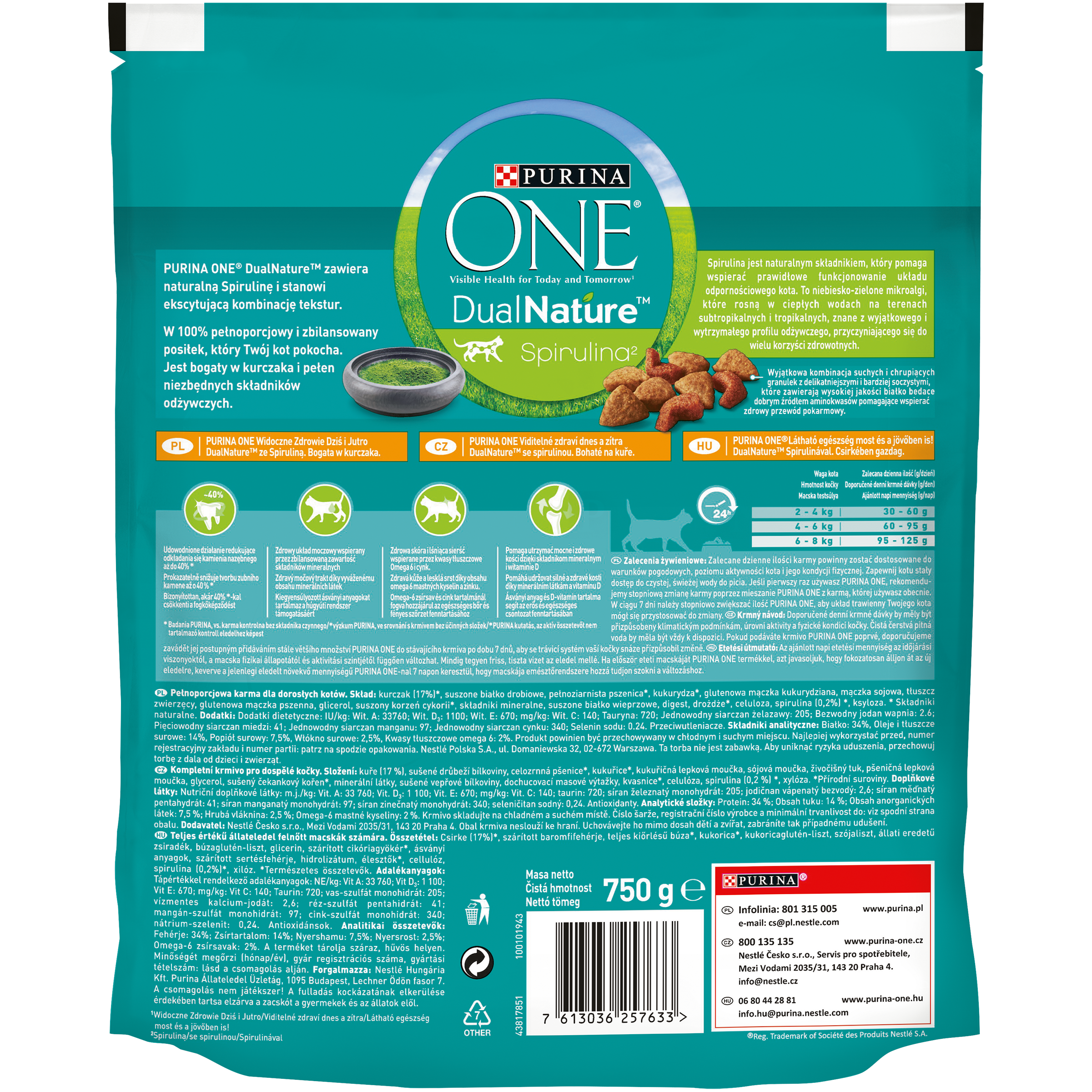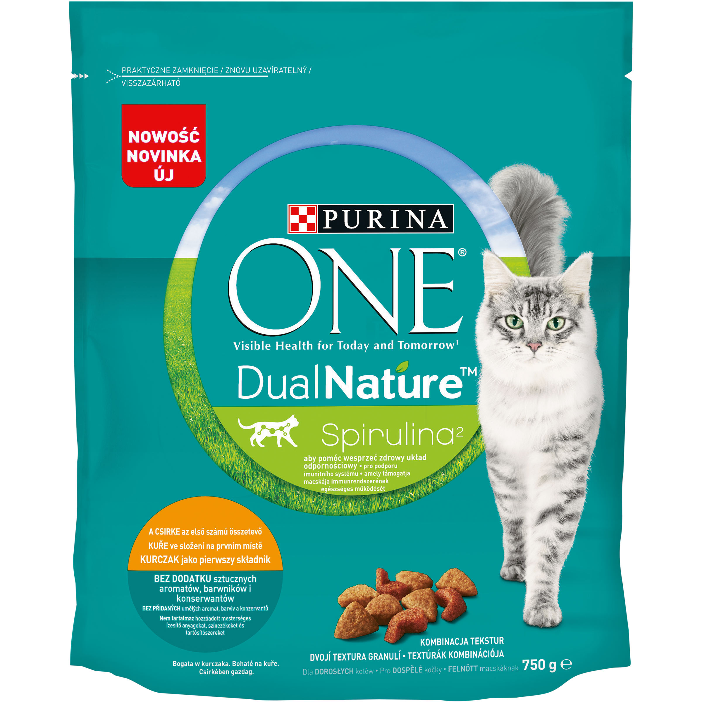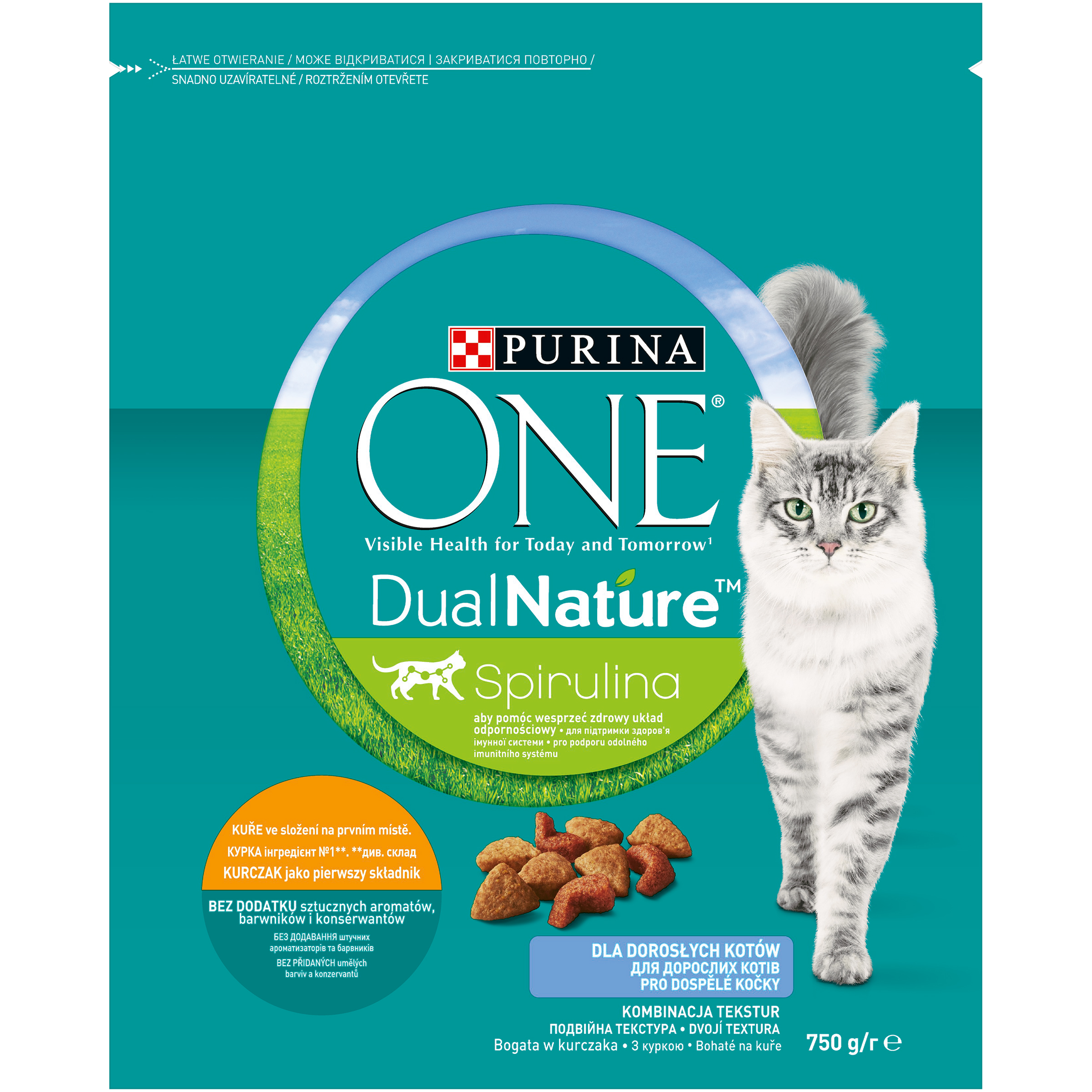 PURINA ONE DualNature zawiera Spirulinę i stanowi ekscytującą kombinację tekstur. W 100% pełnoporcjowy i zbilansowany posiłek, który Twój kot pokocha. Jest bogaty w kurczaka i pełen niezbędnych składników odżywczych. Spirulina jest składnikiem, który pomaga wspierać prawidłowe funkcjonowanie układu odpornościowego kota. To niebiesko-zielone mikroalgi, które rosną w ciepłych wodach na terenach subtropikalnych i tropikalnych, znane z wyjątkowego i wytrzymałego profilu odżywczego, przyczyniającego się do wielu korzyści zdrowotnych. Wyjątkowa kombinacja suchych i chrupiących granulek z delikatniejszymi i bardziej soczystymi, które zawierają wysokiej jakości białko będące dobrym źródłem aminokwasów pomagające wspierać zdrowy przewód pokarmowy. PURINA ONE Widoczne Zdrowie Dziś i Jutro DualNature ze Spiruliną. Bogata w kurczaka. Udowodnione działanie redukujące odkładanie się kamienia nazębnego aż do 40%* Zdrowy układ moczowy wspierany przez zbilansowaną zawartość składników mineralnych Zdrowa skóra i lśniąca sierść wspierane przez kwasy tłuszczowe Omega 6 i cynk Pomaga utrzymać mocne i zdrowe kości dzięki składnikom mineralnym i witaminie D *Badania PURINA, vs. karma kontrolna bez składnika czynnego.