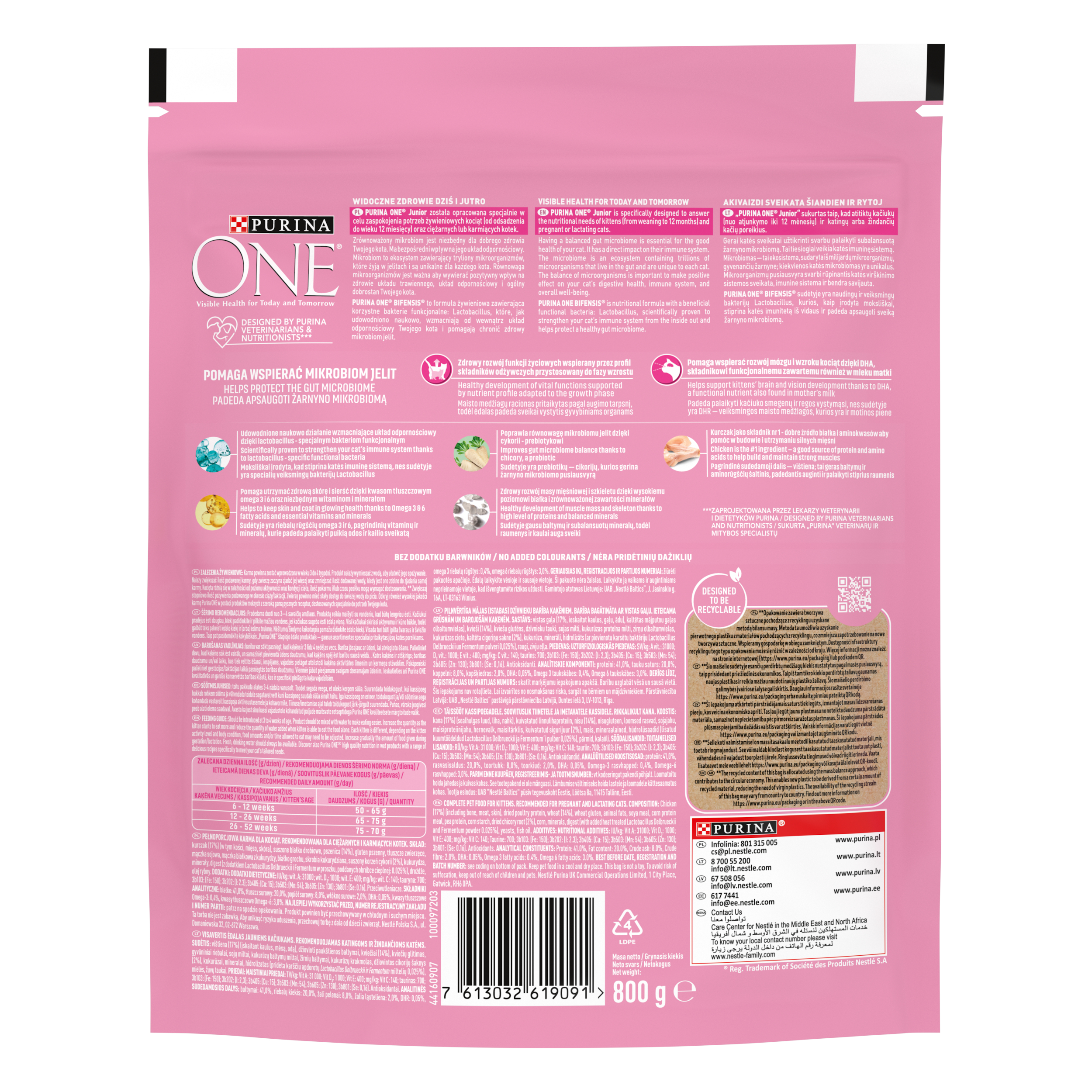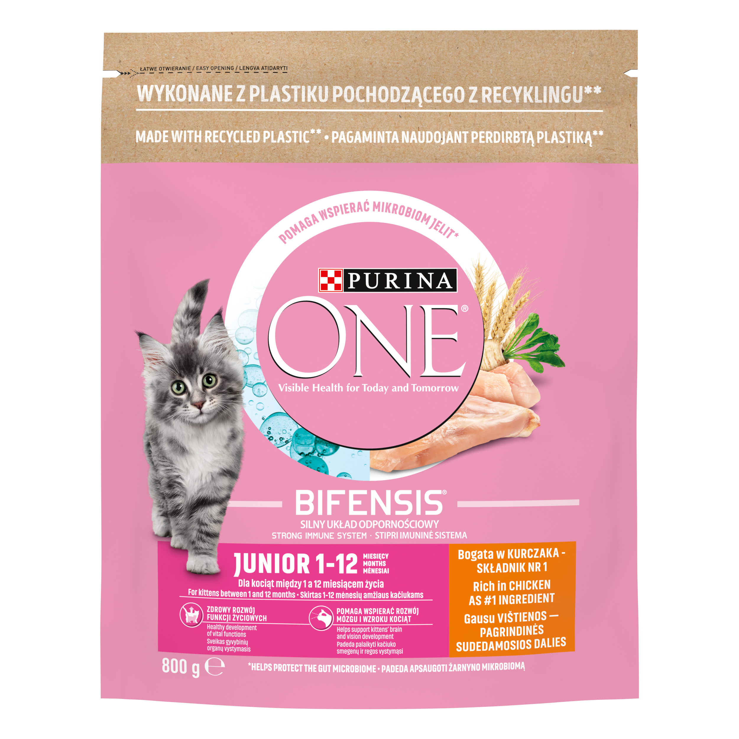 PURINA ONE Junior została opracowana specjalnie w celu zaspokojenia potrzeb żywieniowych kociąt (od odsadzenia do wieku 12 miesięcy) oraz ciężarnych lub karmiących kotek. PURINA ONE Bifensis to unikalna formuła żywieniowa zawierająca korzystne bakterie funkcjonalne, które, jak udowodniono naukowo, wzmacniają od wewnątrz ochronę organizmu Twojego kota. Opracowana przez lekarzy weterynarii i dietetyków Purina, PURINA ONE Bifensis zawiera, poza korzystnymi bakteriami funkcjonalnymi, wszystkie najważniejsze składniki odżywcze, których potrzebuje Twój kot, w tym kwasy tłuszczowe Omega 6. Jej podwójna formuła ochronna działa od wewnątrz, pomagając wspierać produkcję przeciwciał u Twojego kota, a także na zewnątrz, utrzymując zdrową skórę i sierść. Dostępna w szerokiej gamie smaków z wysokiej jakości składnikami, takimi jak kurczak jako główny składnik, PURINA ONE Bifensis wspiera ochronę Twojego kota dziś i jutro. Bez dodatku barwników, bez dodatku sztucznych aromatów, bez dodatku sztucznych konserwantów. Zdrowy rozwój funkcji życiowych wspierany przez profil składników odżywczych przystosowany do fazy wzrostu Zdrowy rozwój masy mięśniowej i szkieletu dzięki wysokiemu poziomowi białka i zrównoważonej zawartości składników mineralnych Wysoce strawna dzięki zawartości wysokiej jakości składników. Wysokie wchłanianie składników odżywczych dzięki wysokiej jakości składnikom Higiena jamy ustnej dla dziąseł i zębów wspierana przez niezbędne składniki odżywcze i chrupiące kawałki Zawiera DHA, funkcjonalny składnik odżywczy obecny również w mleku matki, o udowodnionej zdolności stymulowania rozwoju mózgu i wzroku kociąt.