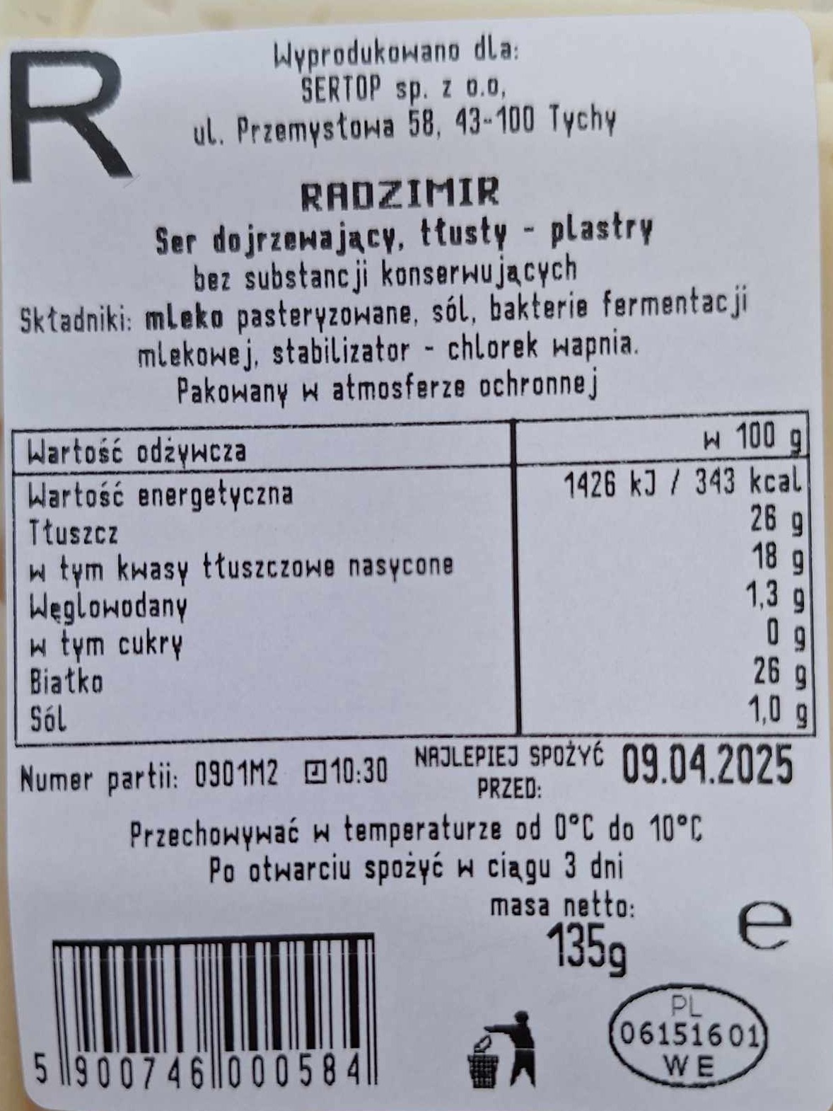 | Składniki | Mleko pasteryzowane, sól, bakterie fermentacji mlekowej, stabilizator - chlorek wapnia |