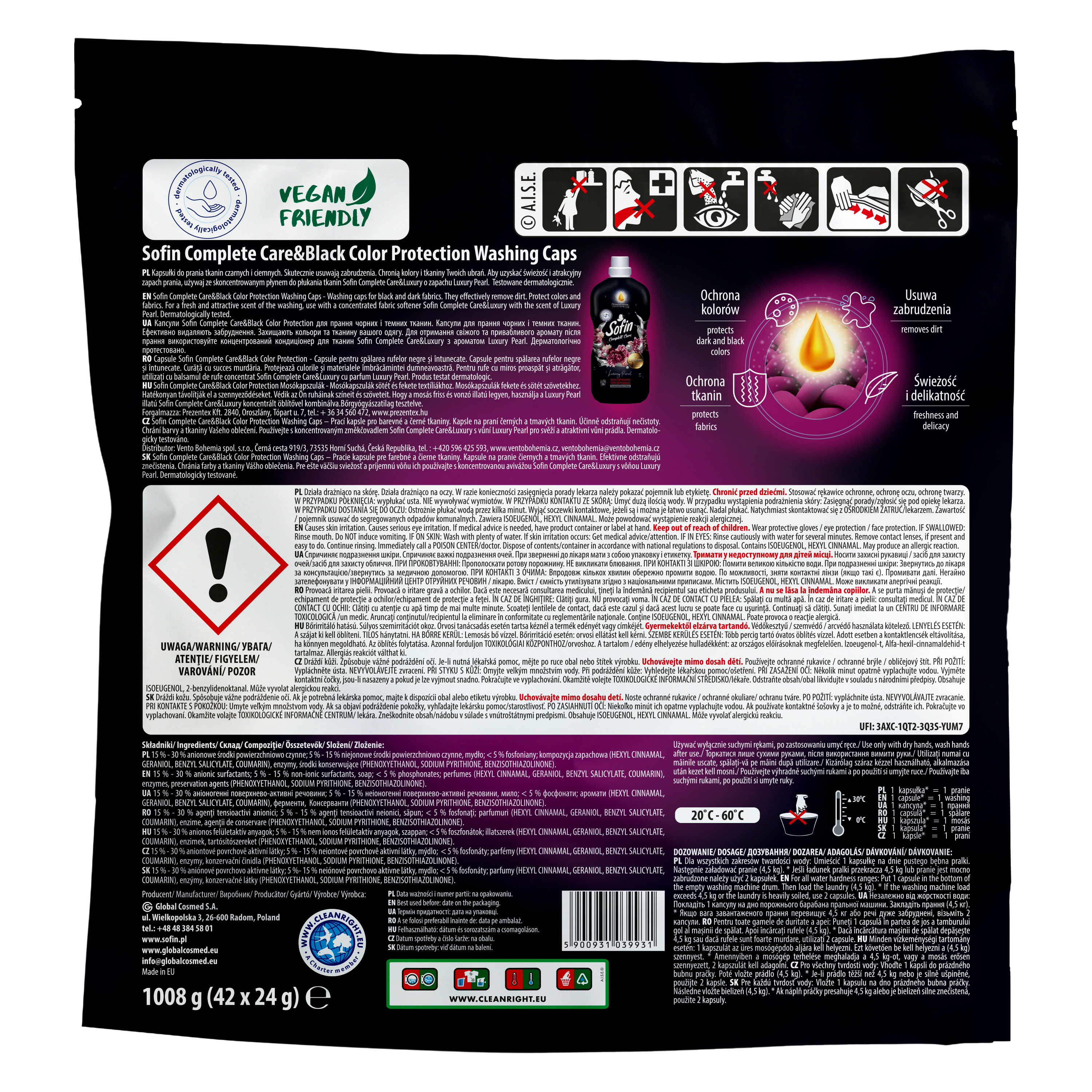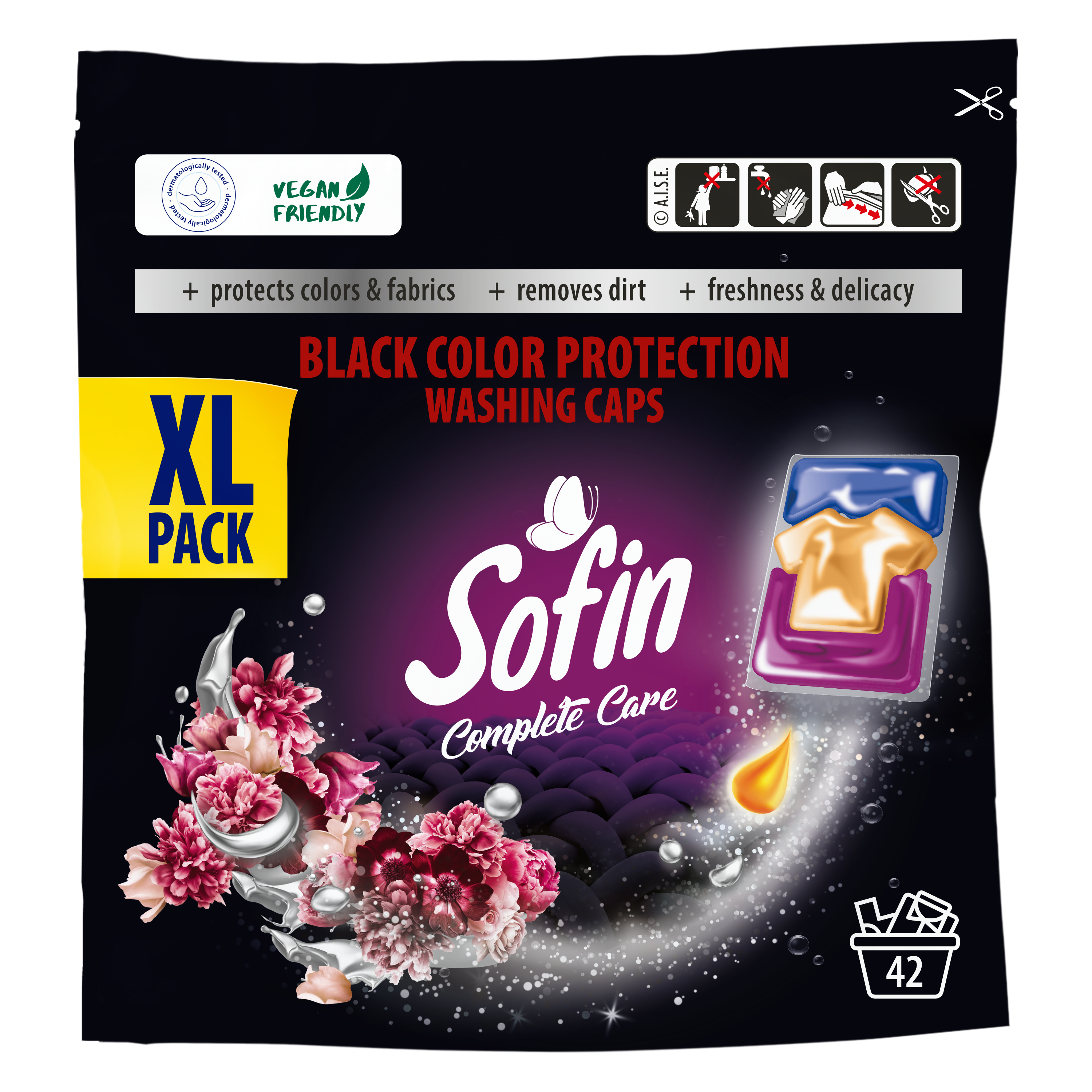 Sofin Complete Care& Dark Color Protection Caps - kapusłki do prania tkanin ciemnych i czarnych zapewnią ubraniom czystość i atrakcyjny zapach. Dla uzyskania najlepszego efektu używać razem z płynem do płukania Sofin Complete Care&Luxury Pearl.