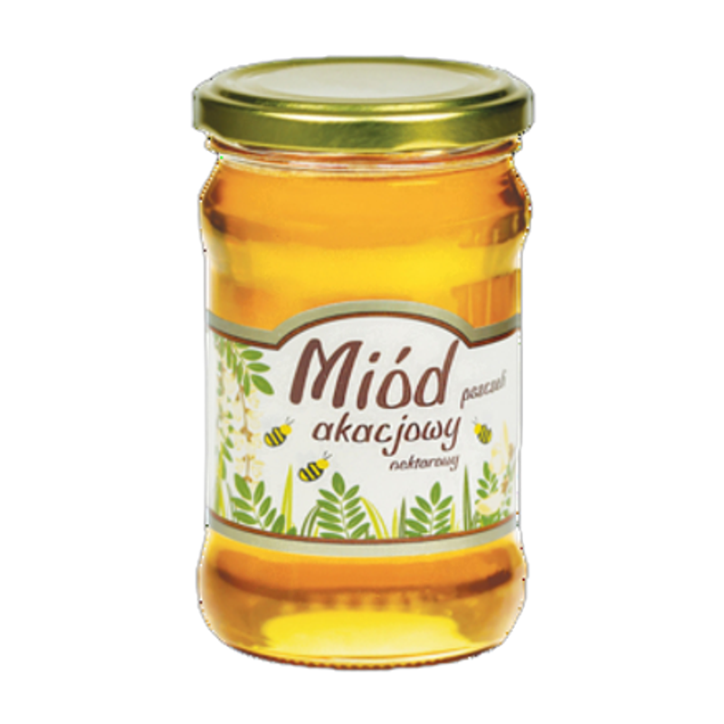 Jest najjaśniejszym miodem, niekiedy nawet bezbarwnym, najczęściej spotkamy go w barwie jasnokremowej lub słomkowej. Ma charakterystyczny delikatny zapach kwiatu akacji.