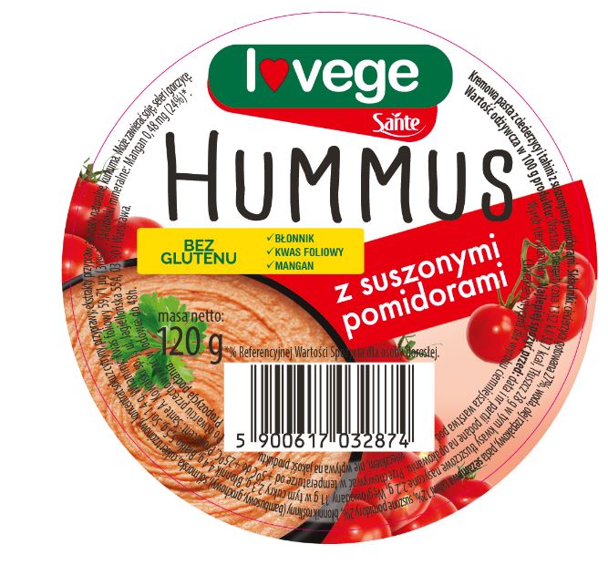 Hummus z suszonymi pomidorami Sante to najwyższej jakości pasta z ciecierzycy i tahini (pasty sezamowej) z dodatkiem aromatycznych przypraw. Ma wspaniały smak i doskonale kremową konsystencję – ani jednej grudki! Hummus z suszonymi pomidorami Sante to produkt bezglutenowy, dostarczający błonnika, kwasu foliowego, manganu i żelaza. Hummus może być stosowany jako przystawka – smarowidło do pieczywa lub jako sos do ryb, mięs i warzyw.