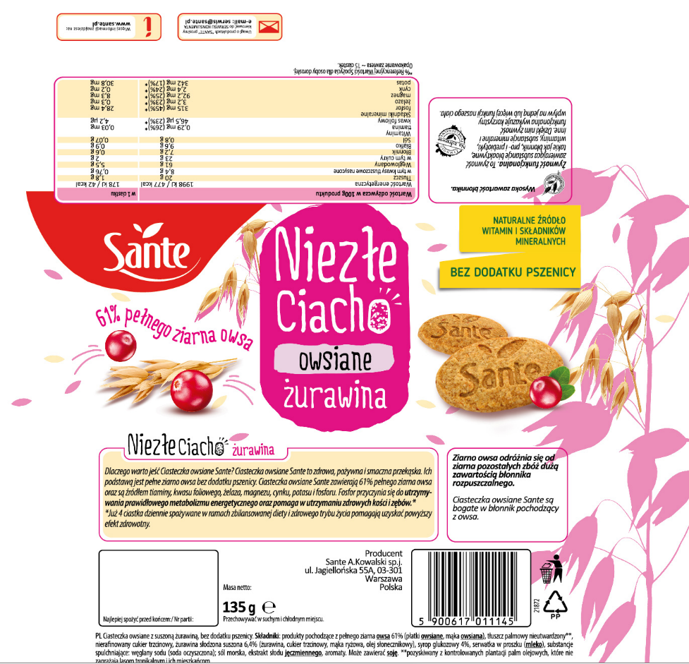 Ciasteczka owsiane Sante to zdrowa, pożywna i smaczne przekąska. Ich podstawą jest pełne ziarno owsa bez dodatku pszenicy. Ciasteczka owsiane Sante zawierają 60,7% produktów pochodzących z pełnego ziarna owsa, witaminę B1, kwas foliowy, żelazo, magnez, cynk, potas i fosfor.