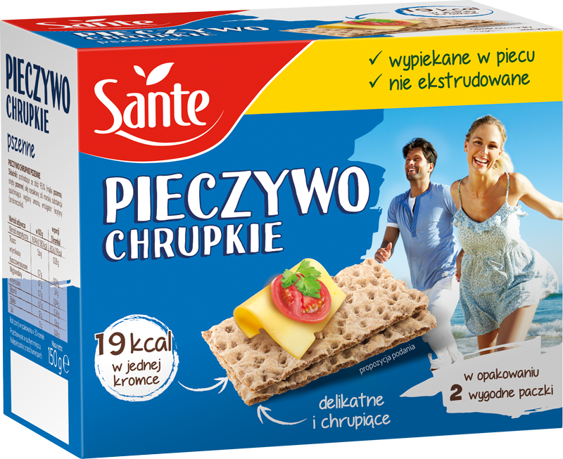Pieczywo chrupkie Sante to delikatnie chrupiące kromki, wypiekane w sposób na żeliwnych płytach. Jest lekkostrawne i smaczne. Jedna kromka zawiera tylko 19 kcal, czyli aż 4 razy mniej niż 1 kromka zwykłego pieczywa pszenno‑żytniego razowego. Nie zawiera konserwantów i ulepszaczy smaku. Polecane dla osób dbających o linię i ceniących dobrą dietę.