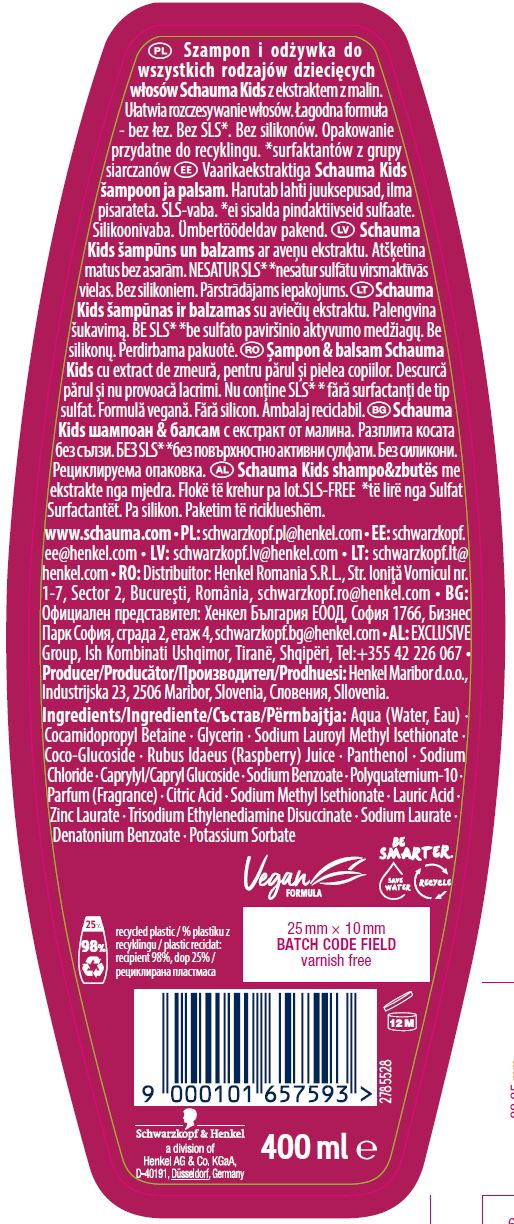Szampon do wszystkich rodzajów dziecięcych włosów i żel pod prysznic Schauma Kids z ekstraktem z borówek. Ułatwia rozczesywanie włosów. Bez SLS*. Bez silikonów. Opakowanie przydatne do recyklingu. *surfaktantów z grupy siarczanów