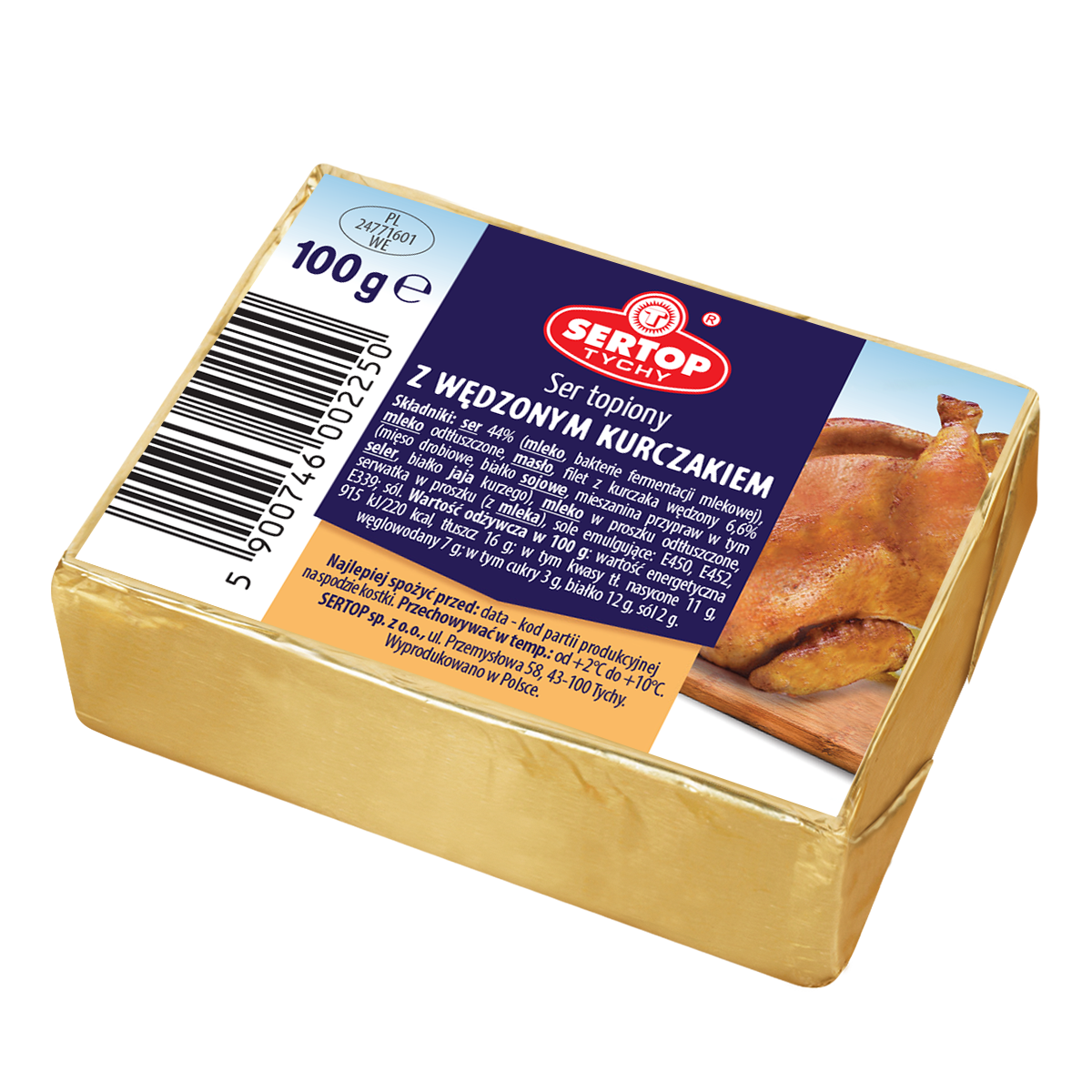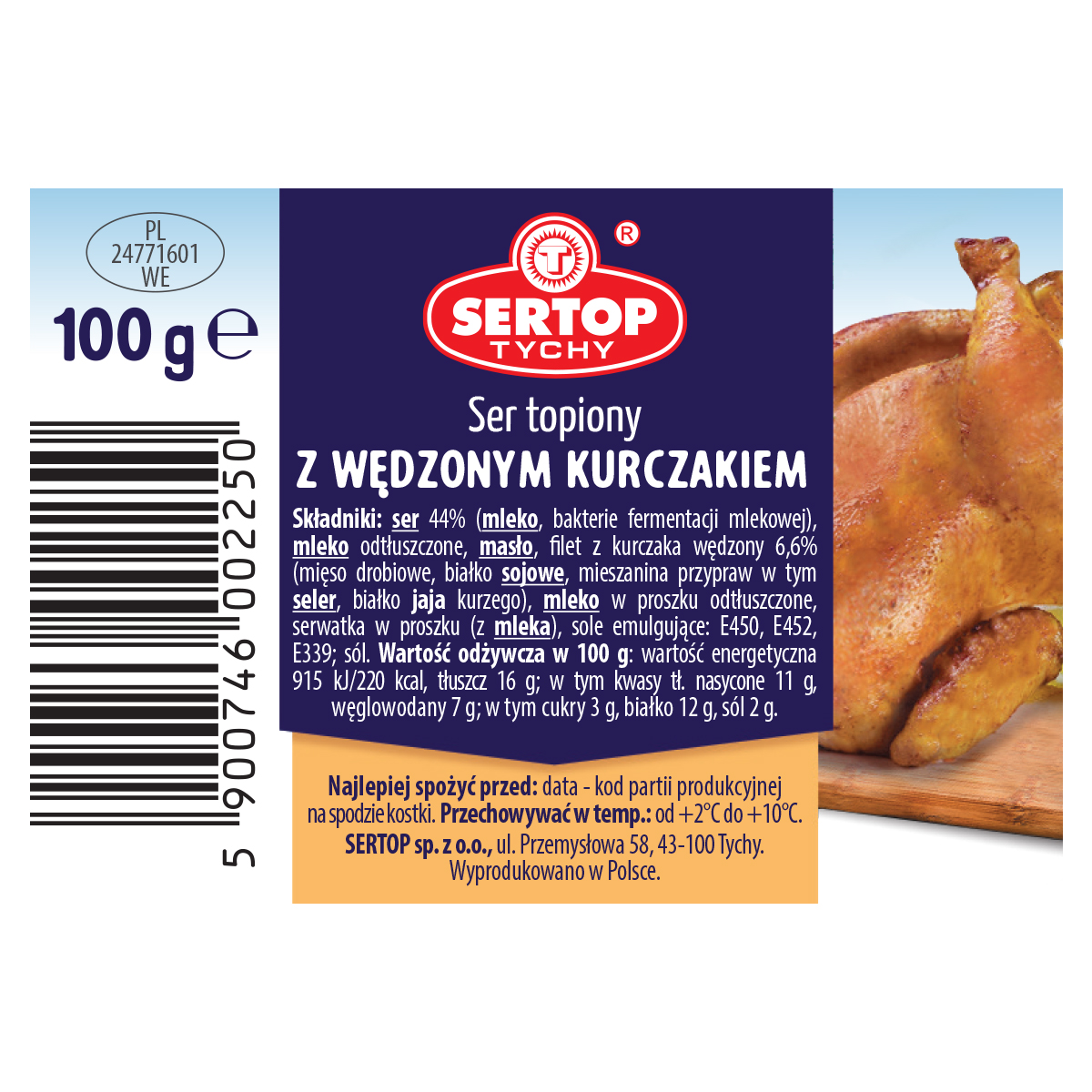 | Składniki | Składniki: ser (mleko, bakterie fermentacji mlekowej), woda, masło ,filet z kurczaka wędzony 7%(mięso drobiowe, białko sojowe, mieszanka przypraw w tym seler, białko jaja kurzego), mleko w proszku odtłuszczone, serwatka w proszku (z mleka), sole emulgujące: e450, e452, e339; sól. |