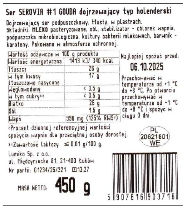 | Zawartość tłuszczu | Pełnotłusty (sery podpuszczkowe) (zaw. tłuszczu 45%) |