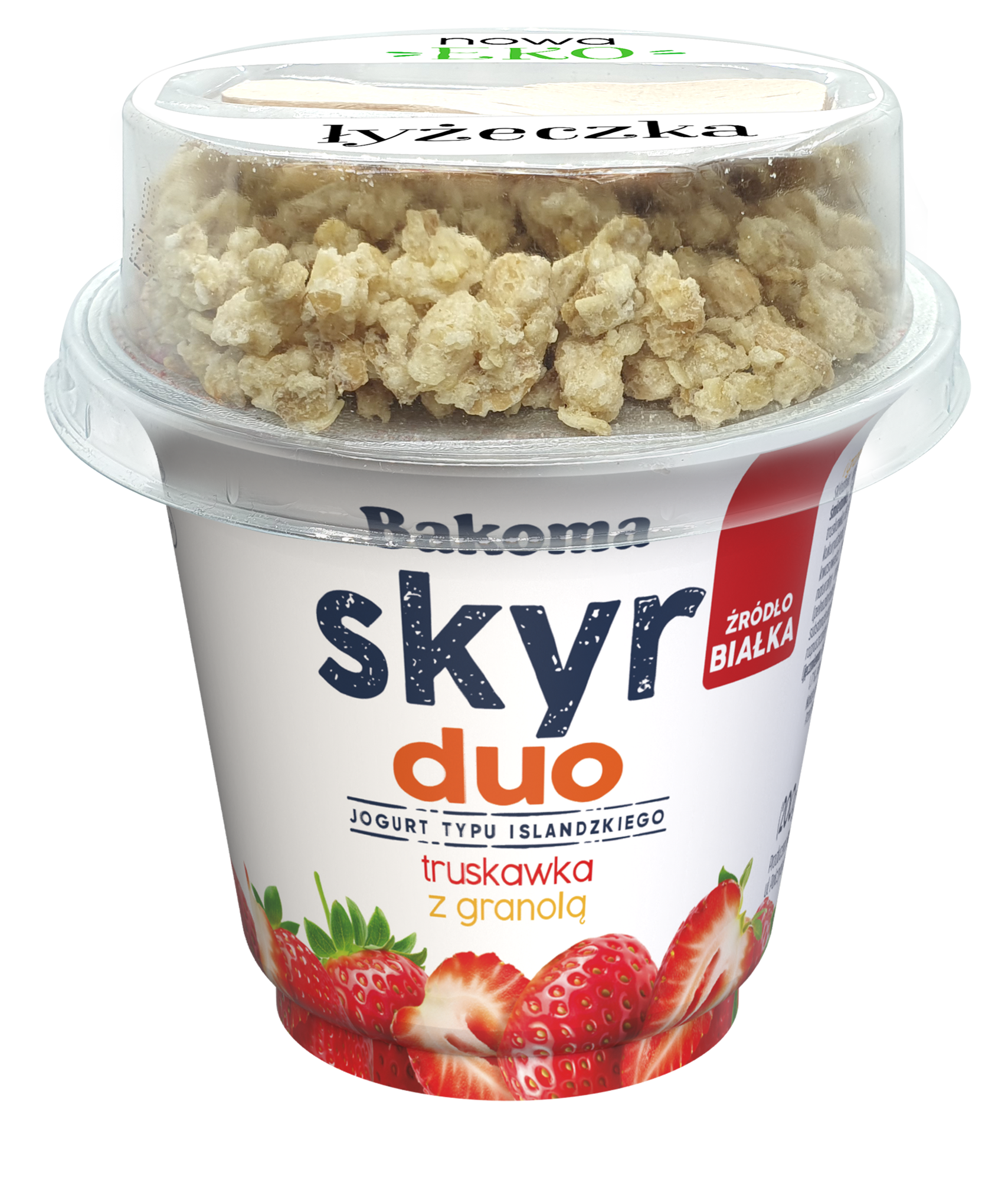 | Składniki | Jogurt 70 % (mleko zagęszczone odtłuszczone, śmietanka, białka mleka, kultury bakterii jogurtowych); wsad truskawka 18 % (truskawka 9 %, cukier, skrobia modyfikowana kukurydziana, substancja zagęszczająca: pektyny; regulator kwasowości: kwas cytrynowy; koncentrat soku z buraka, aromat); granola 12 % [płatki zbożowe 7 % [pełnoziarniste płatki owsiane 4,9 %, płatki jęczmienne), substancja utrzymująca wilgotność: maltitole; olej słonecznikowy, rozpuszczalny błonnik kukurydziany, suszone daktyle, mąka (jęczmienna, kukurydziana), sól, aromaty, cynamon); pestki dyni 1,7%, słonecznik łuskany 1,1 %]. może zawierać soję. |