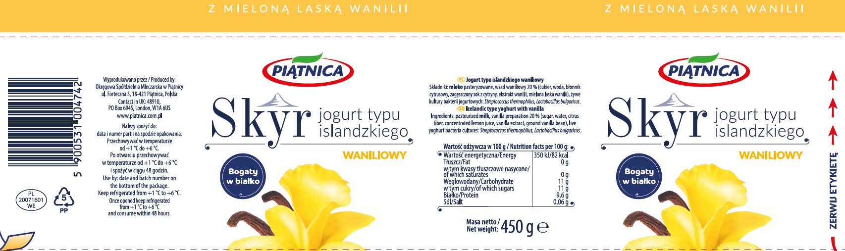 Jego śmietankowy smak wzbogaciliśmy zmieloną laską wanilii, zachowując jednolitą konsystencję. Gęsty i delikatny, zawiera dużo białka, dodaje siły i krzepy do działania. Skyr to pyszna i Porcja energii dla każdego!.