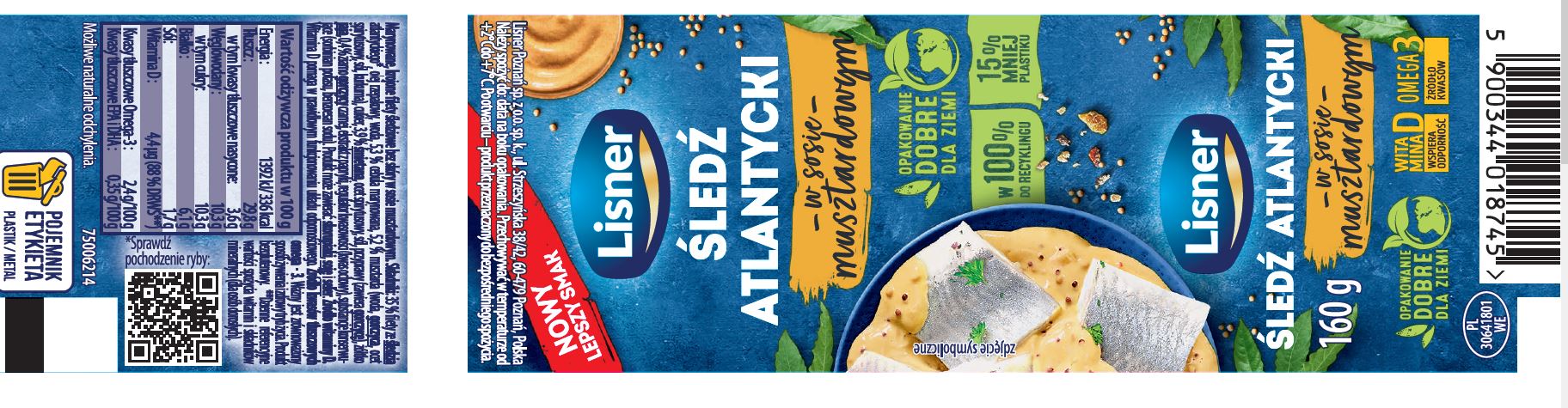 | Składniki | 35% filety ze śledzia atlantyckiego*, olej rzepakowy, woda, 5,3% cebula marynowana, 5,2% musztarda (woda, gorczyca, ocet spirytusowy, sól, kurkuma), cukier, 3,9% śmietana, ocet spirytusowy, sól, przyprawy (zawierają gorczycę), żółtko jaja, 0,4% ziarno gorczycy czarnej, ekstrakt z papryki, regulator kwasowości (kwas octowy), substancje konserwujące (sorbinian potasu, benzoesan sodu). Produkt może zawierać: skorupiaki, soję i seler. |