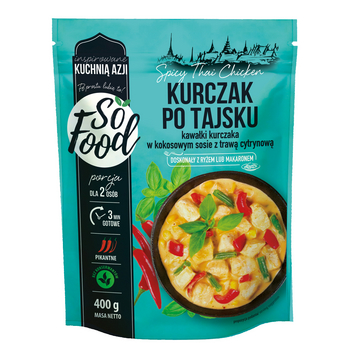 Kurczak po tajsku to pikantne i aromatyczne danie, które doskonale oddaje esencję kuchni azjatyckiej. Doskonale skomponuje się z ryżem jaśminowym lub basmati. Wystarczy podgrzać i gotowe. Idealne na pyszny obiad dla 2 osób.