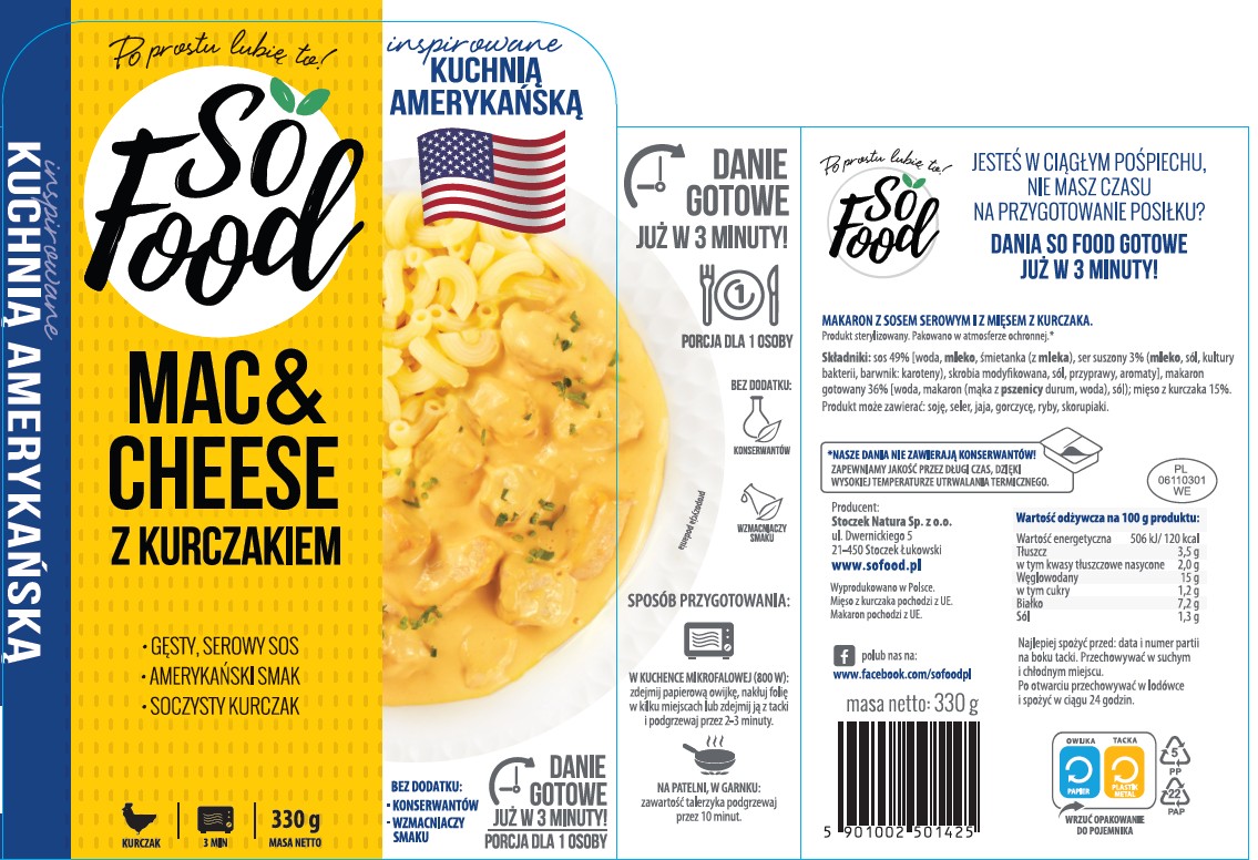 | Krótki opis marketingowy | Spróbuj naszego mac & cheese z kurczakiem, inspirowanego kultową kuchnią usa! soczyste kawałki delikatnego kurczaka, zanurzone w kremowym, gęstym sosie serowym idealnie łączą się z klasycznym makaronem kolanka. szybki i wygodny sposób na lunch w pracy, obiad w domu czy kolację po intensywnym dniu. bez gotowania, bez stresu, zawsze wtedy, kiedy potrzebujesz chwili przyjemności. gotowe w 3 minuty. wystarczy odgrzać w mikrofalówce. bez dodatku konserwantów wzmacniaczy smaku. |