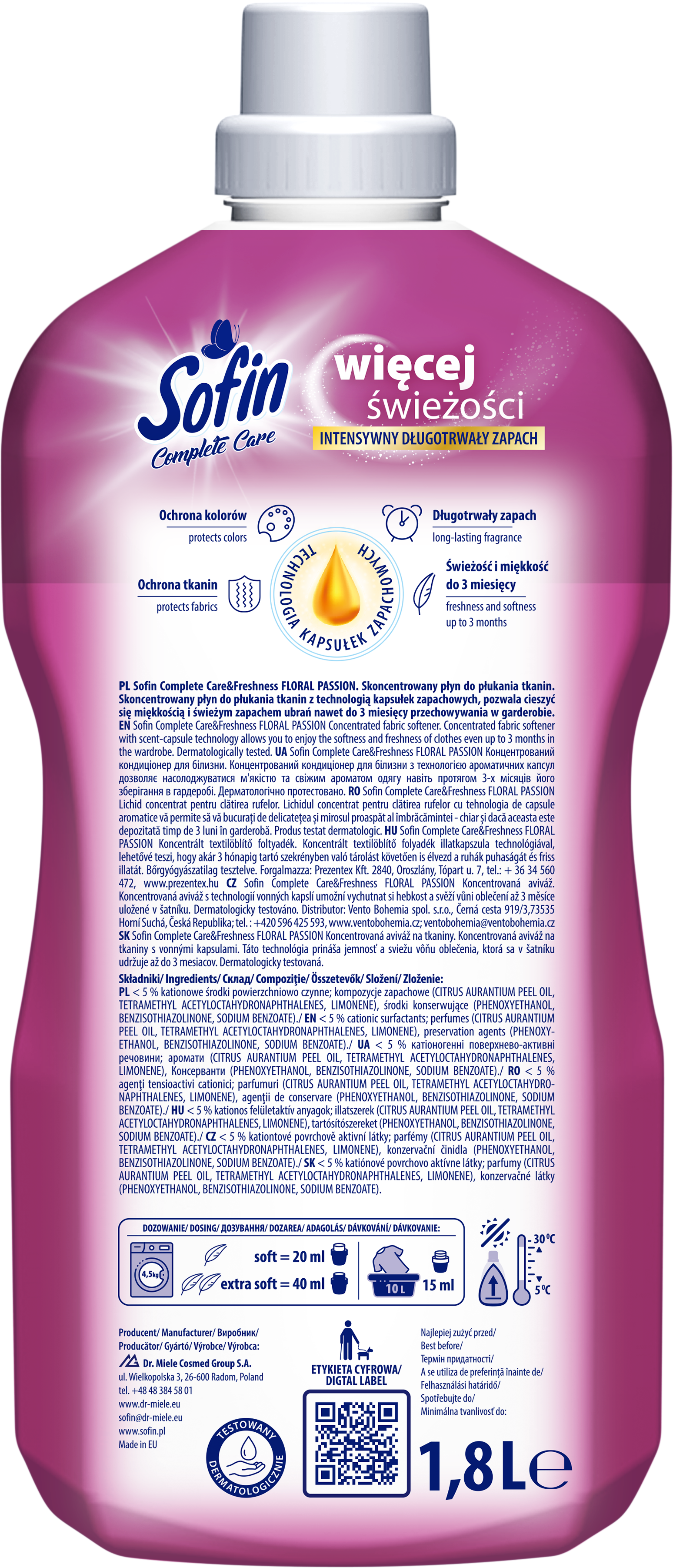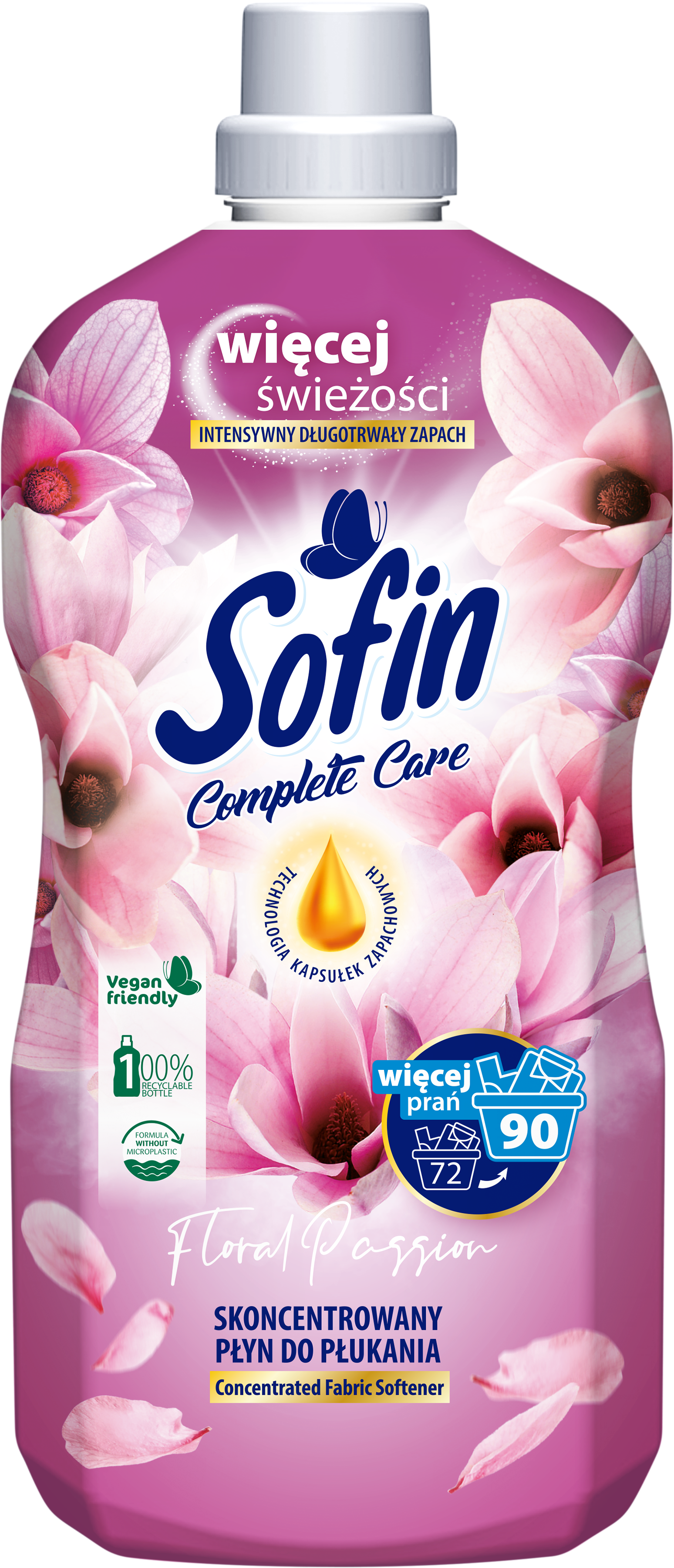SOFIN Complete Care to skoncentrowane płyny do płukania w zupełnie nowej odsłonie, które zachwycą Ciebie i Twoich bliskich. Intensywne, piękne zapachy oparte na technologii kapsułek zapachowych, zapewnią Twoim ubraniom świeżość i miękkość aż do 3 miesięcy Skoncentrowany płyn do płukania w pojemności 1,8L = 72 płukania Atrakcyjny, długotrwały zapach Ochrona kolorów Ochrona tkanin.