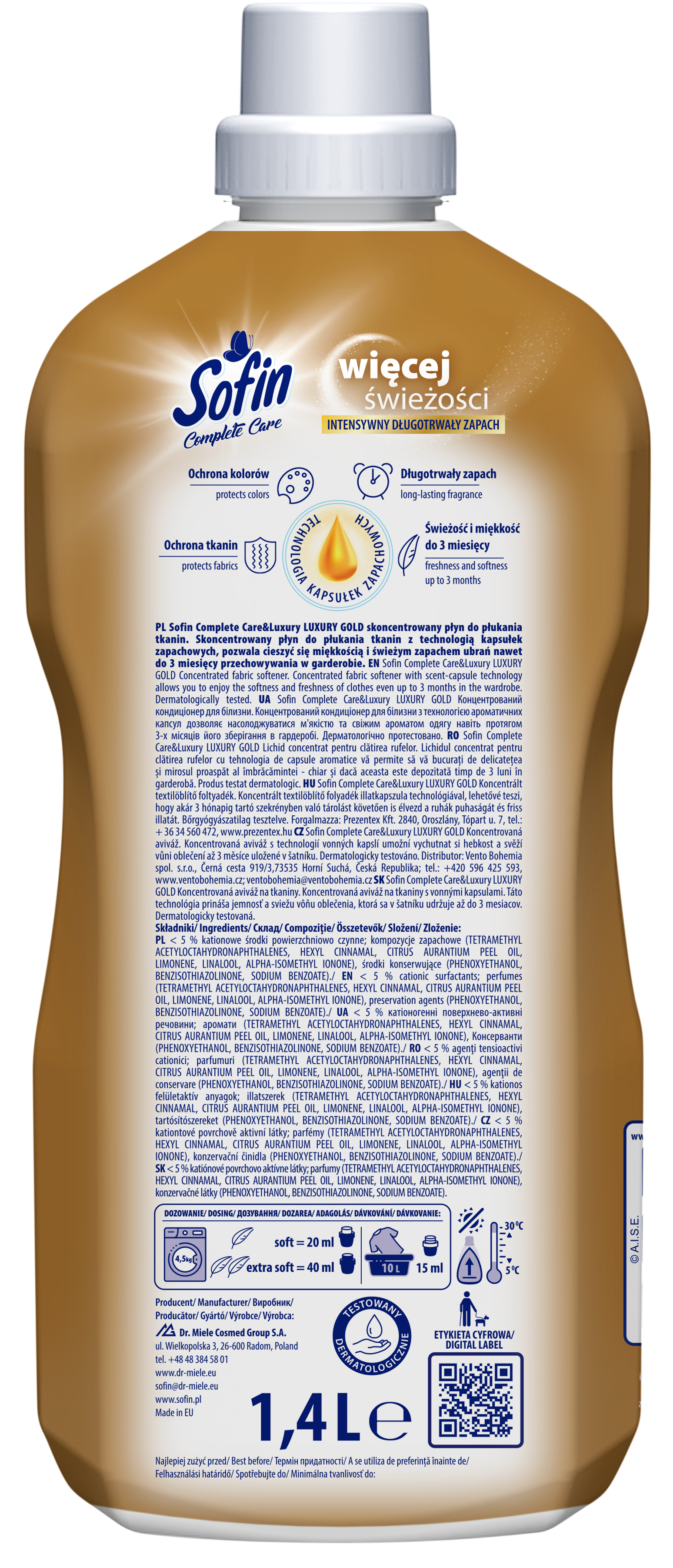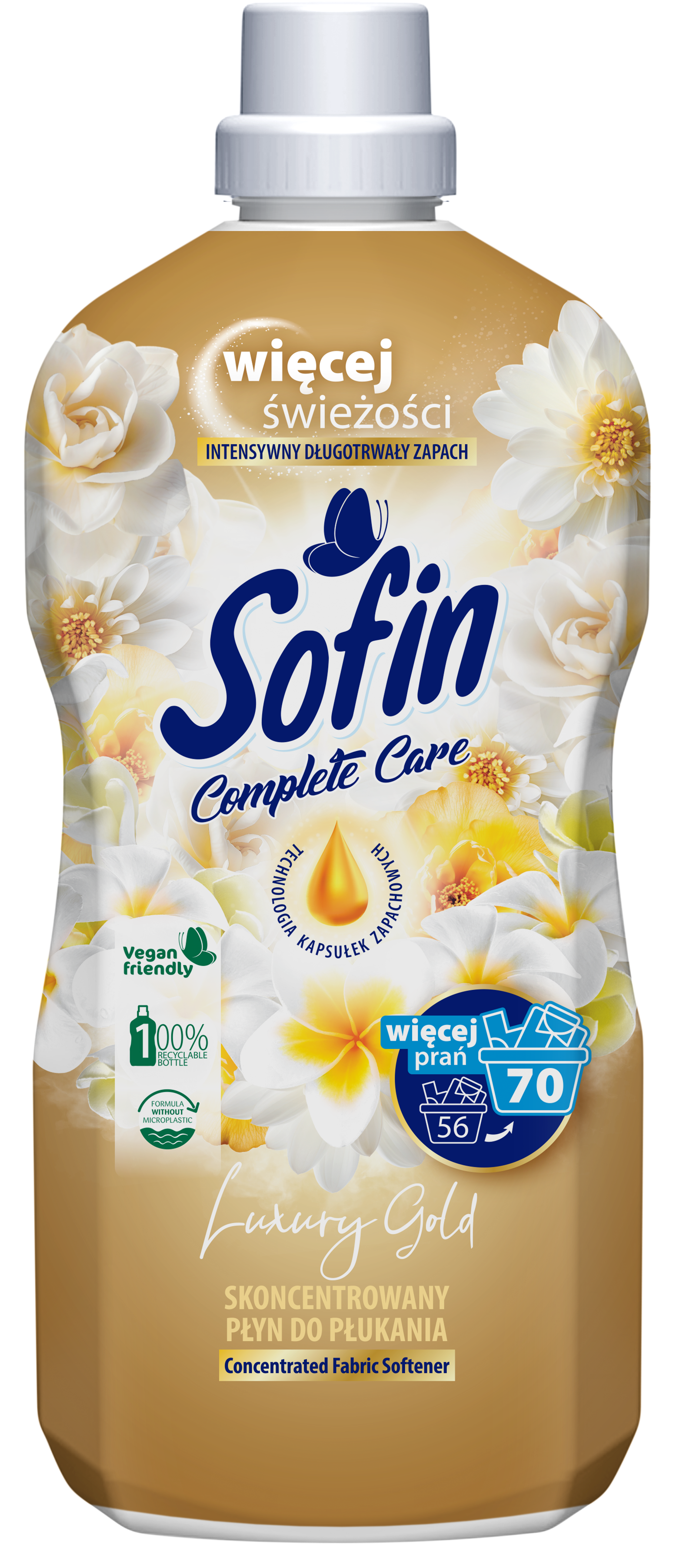 SOFIN Complete Care to skoncentrowane płyny do płukania w zupełnie nowej odsłonie, które zachwycą Ciebie i Twoich bliskich. Intensywne, piękne zapachy oparte na technologii kapsułek zapachowych, zapewnią Twoim ubraniom świeżość i miękkość aż do 3 miesięcy Skoncentrowany płyn do płukania w pojemności 1,8L = 72 płukania Atrakcyjny, długotrwały zapach Ochrona kolorów Ochrona tkanin.