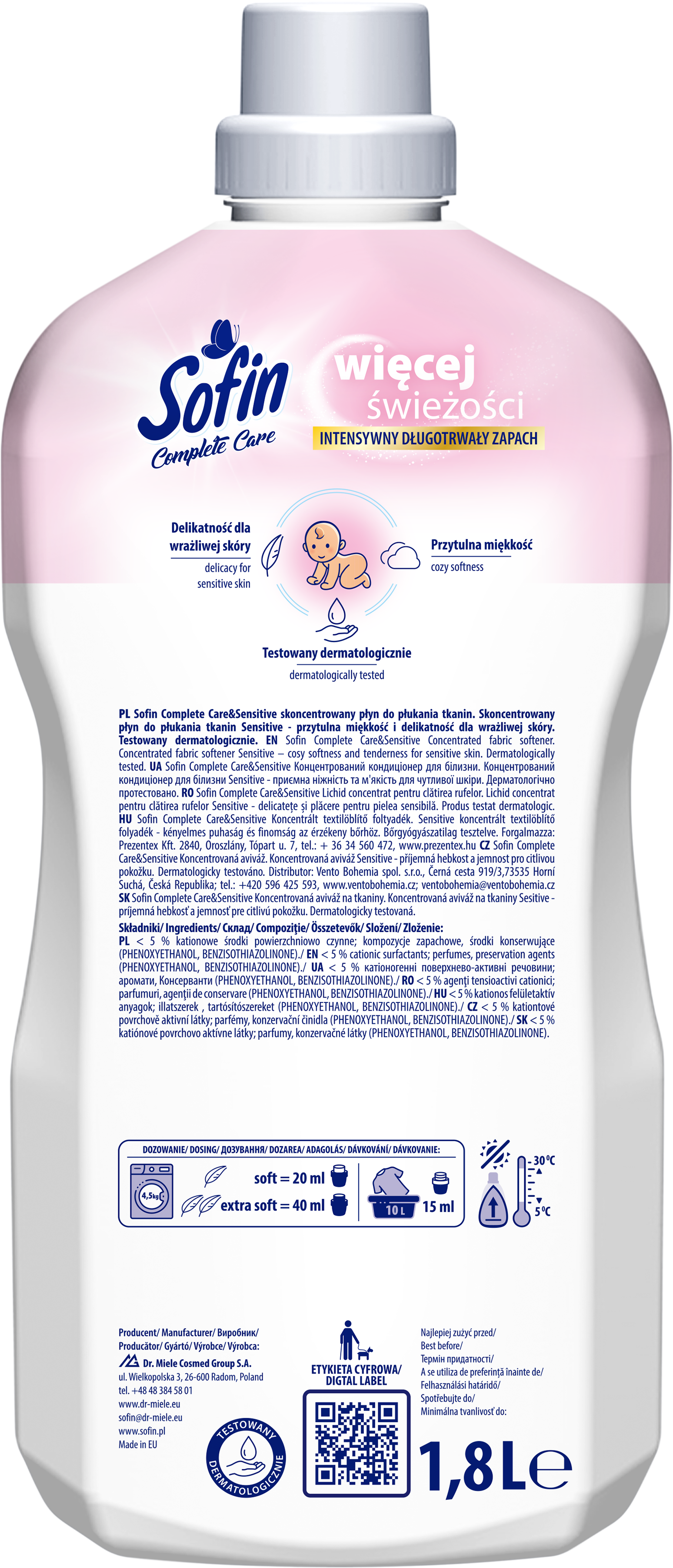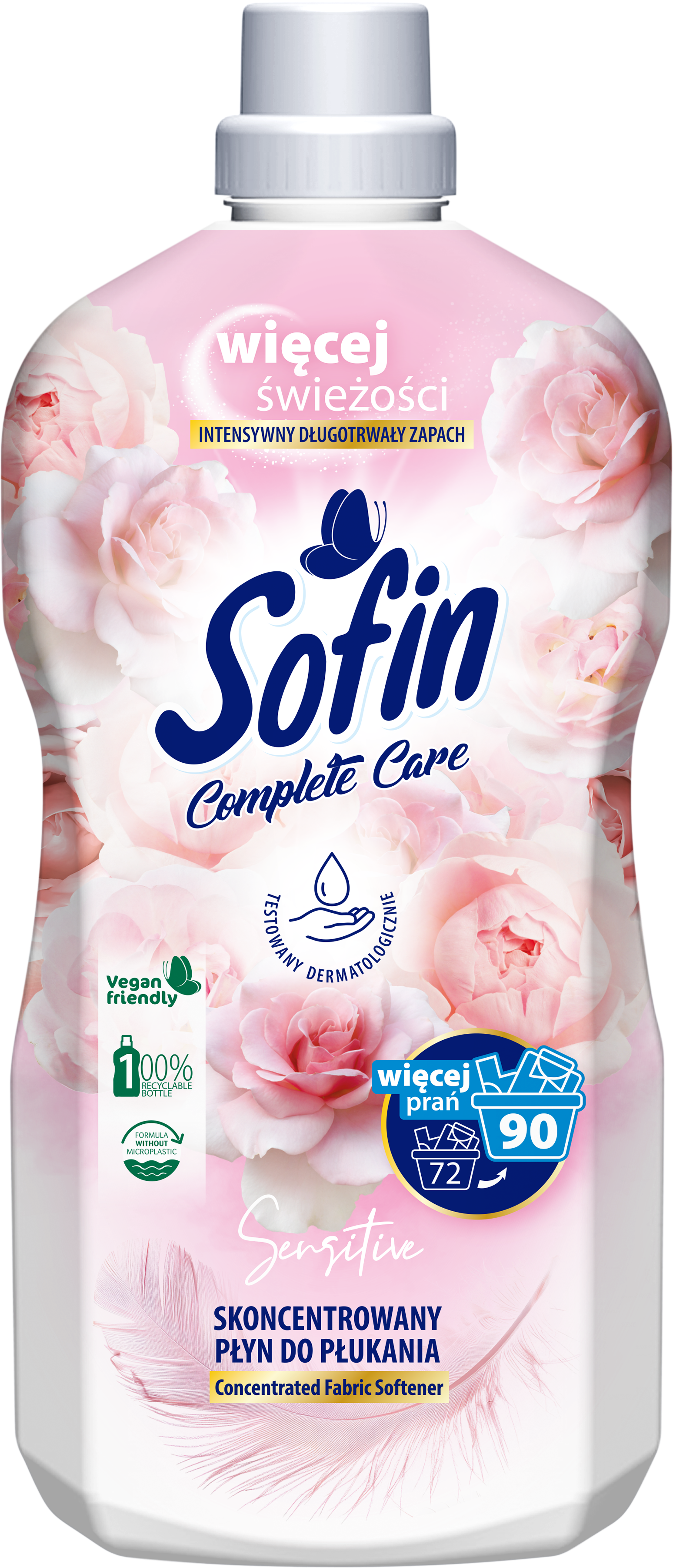 SOFIN Complete Care to skoncentrowane płyny do płukania w zupełnie nowej odsłonie, które zachwycą Ciebie i Twoich bliskich. Skoncentrowany płyn do płukania w pojemności 1,8L = 72 płukania Przytulna miękkość i delikatność dla wrażliwej skóry Testowany dermatologicznie, bezpieczny dla wrażliwej skóry.