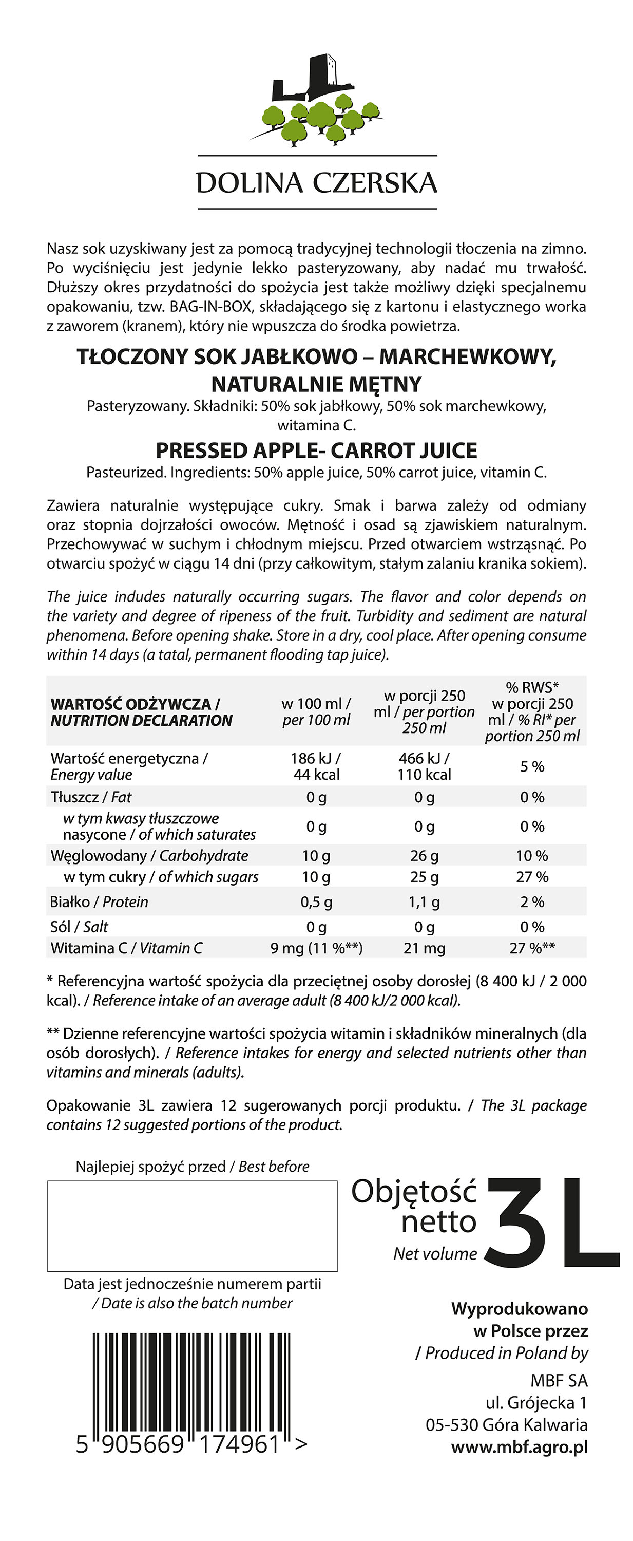 SkładnikiSok jabłkowy 50%, sok marchwiowy 50%, witamina c