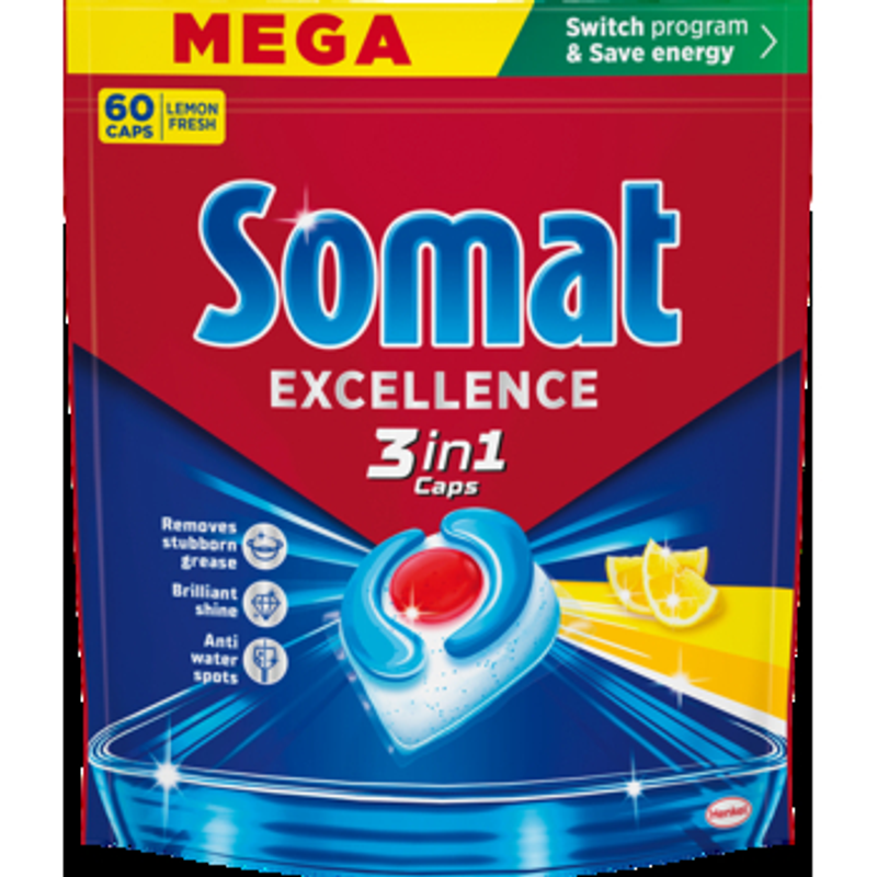 Somat Excellence 3w1 Lemon- kapsułki do zmywarki dla doskonałej czystości, lśniącego blasku i bez zacieków! Kapsułki Somat Excellence 3w1 to zaawansowana formuła, która zapewnia potrójne działanie: skutecznie usuwa nawet najbardziej uporczywy tłuszcz, zapobiega powstawaniu zacieków oraz chroni delikatne naczynia przed zniszczeniem. Każda kapsułka zawiera proszek czyszczący i trzy komory z żelem zamknięte w biodegradowalnej i w pełni rozpuszczalnej w wodzie osłonce.