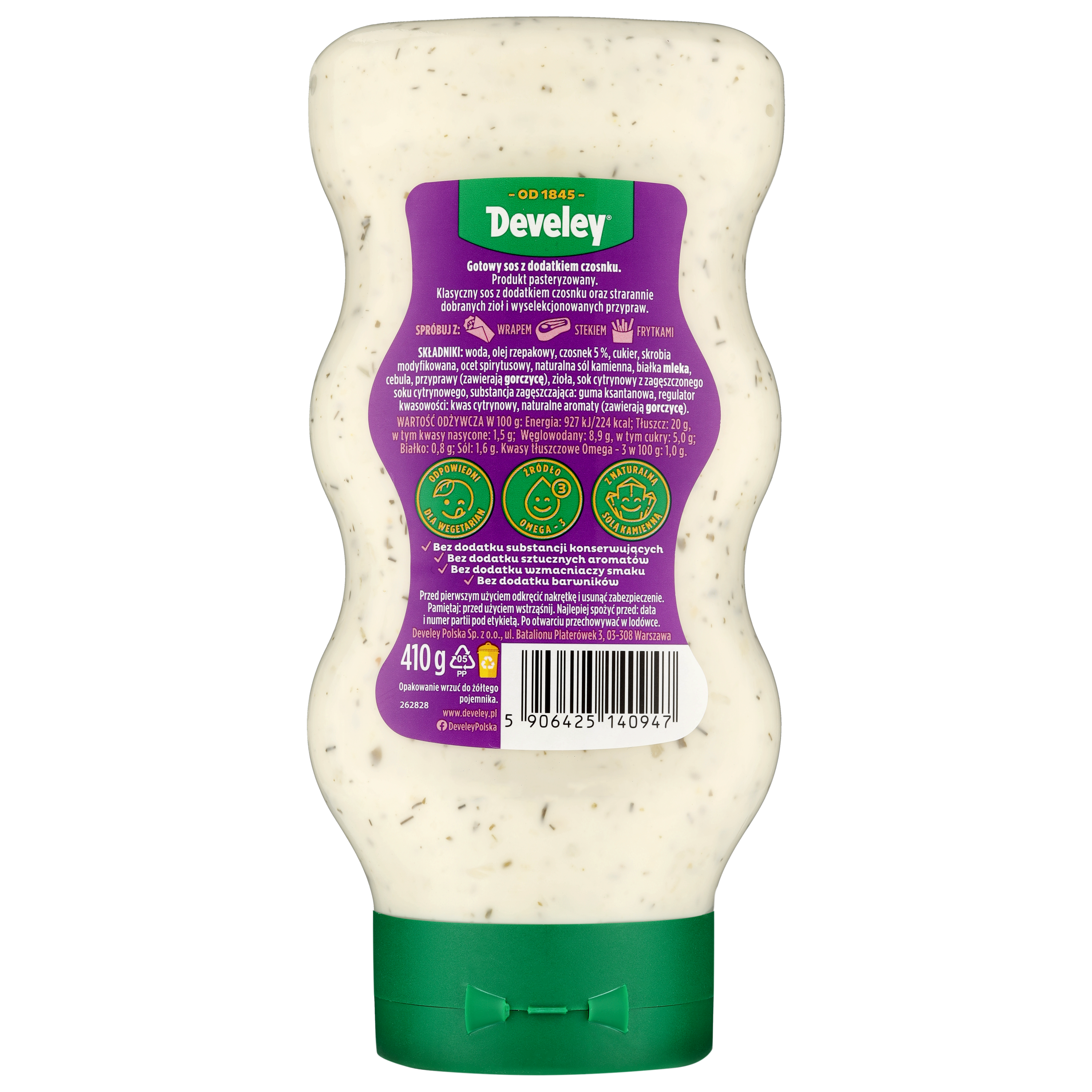 | Składniki | Woda, olej rzepakowy, czosnek 5 %, cukier, skrobia modyfikowana, ocet spirytusowy, sól kamienna, białka mleka, cebula, przyprawy (zawierają gorczycę), zioła, sok cytrynowy z zagęszczonego soku cytrynowego, substancja zagęszczająca: guma ksantanowa, regulator kwasowości: kwas cytrynowy, aromaty (zawierają gorczycę). |
