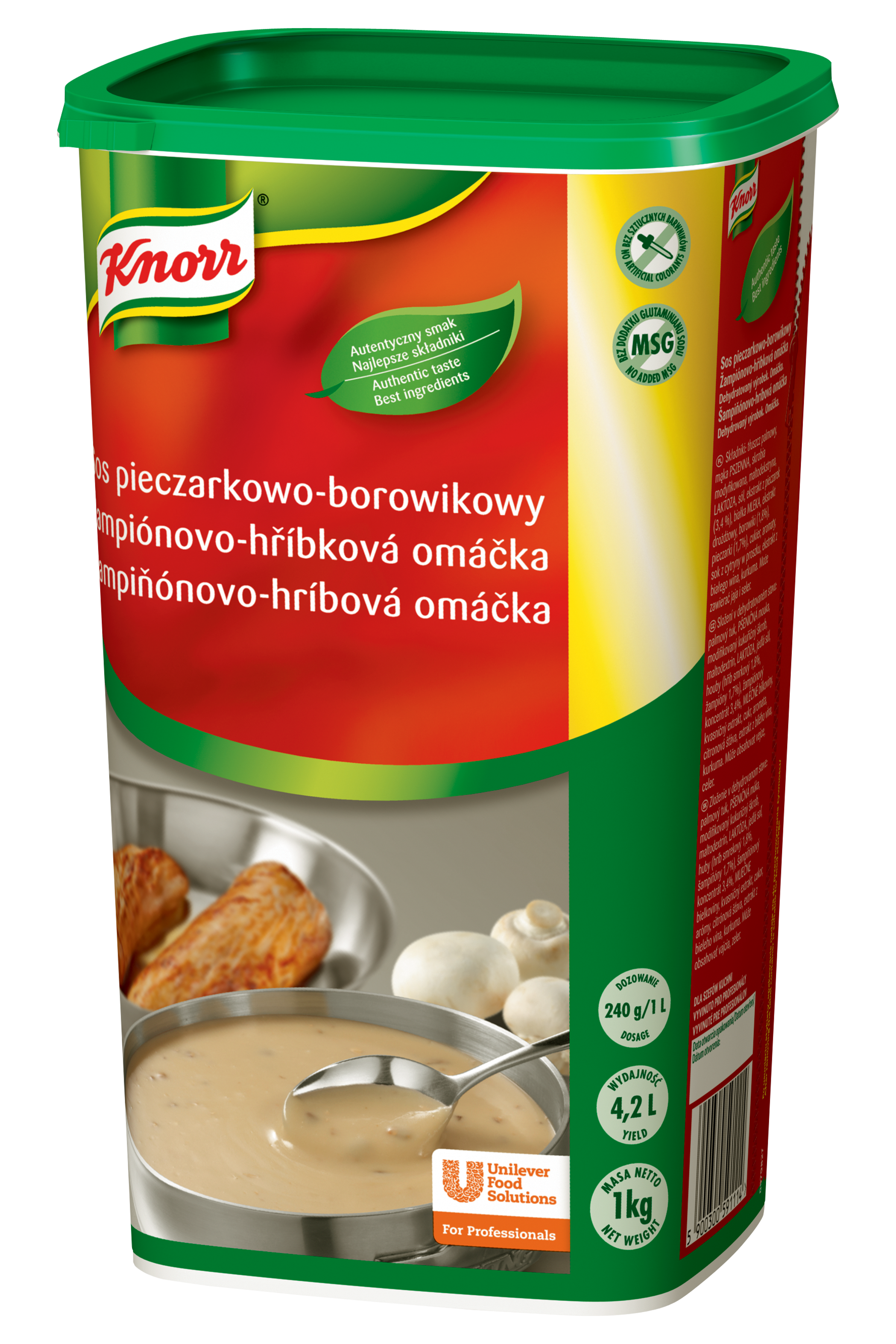 | Składniki | Tłuszcz palmowy, mąka pszenna, maltodekstryna, skrobia modyfikowana, laktoza, sól, ekstrakt z pieczarek (3,2 %), preparat serwatkowy (mleko), ekstrakt drożdżowy, białka mleka, borowiki (1,8%), pieczarki (1,7%), cukier, aromaty, sok z cytryny suszony, ekstrakt z białego wina, kurkuma. |