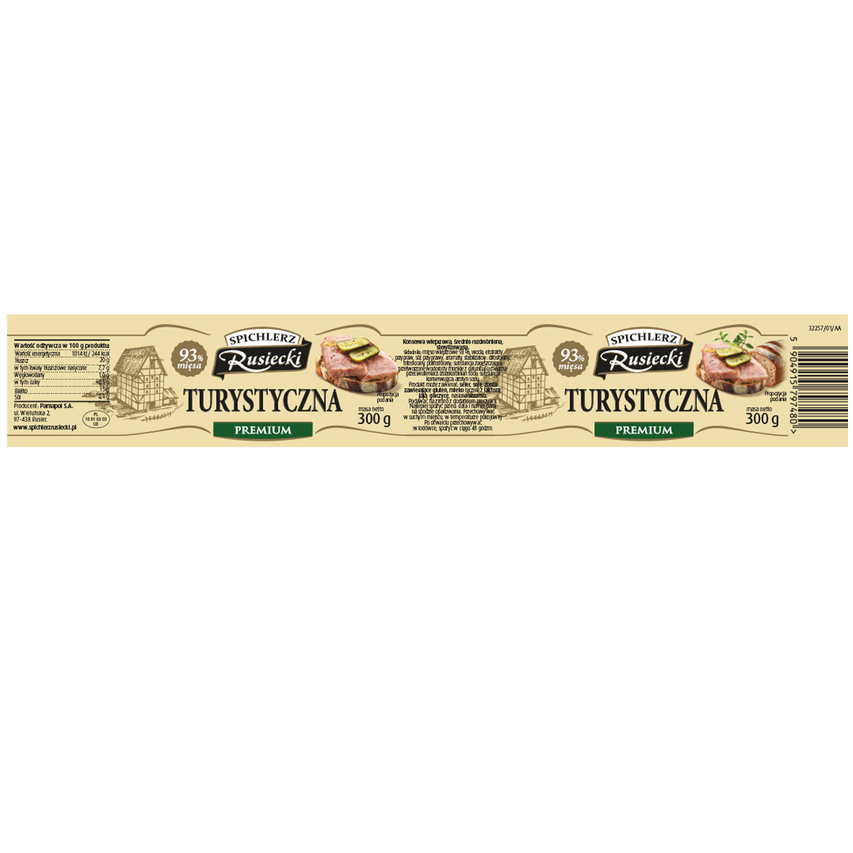 | Składniki | Mięso wieprzowe 93 %, woda, ekstrakty przypraw, sól, przyprawy, aromaty, stabilizatory: difosforany, trifosforany, polifosforany; substancja zagęszczająca: przetworzone wodorosty morskie z gatunku eucheuma; przeciwutleniacz: izoaskorbinian sodu; substancja konserwująca: azotyn sodu. |
