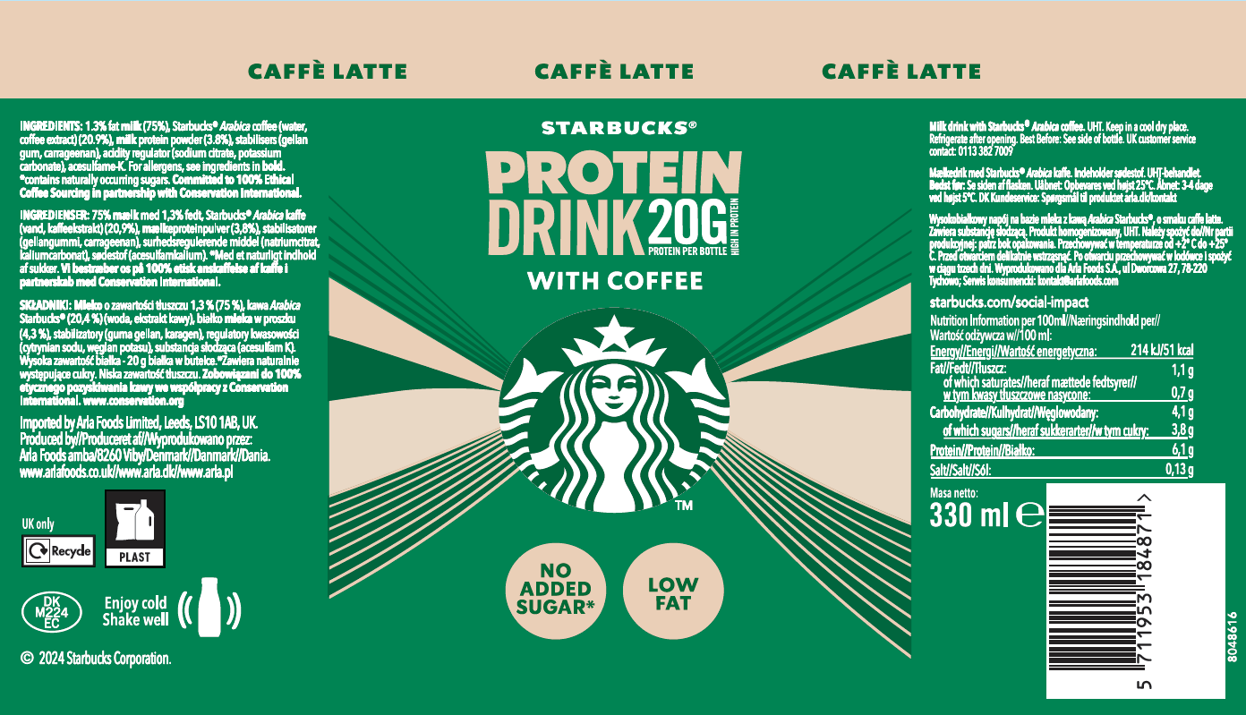 | Krótki opis marketingowy | Zawierające 20g białka starbucks® protein caffe latte to unikalne połączenie naszej aromatycznej kawy arabica starbucks oraz kremowego mleka o niskiej zawartości tłuszczów, bez dodatku cukrów. |