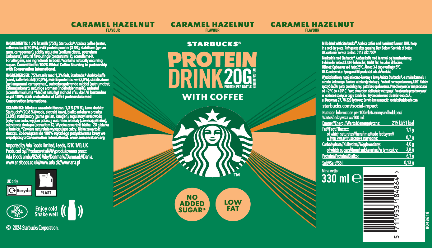 | Krótki opis marketingowy | Zawierające 20g białka starbucks® protein caramel hazelnut to unikalne połączenie naszej aromatycznej kawy arabica starbucks, słodkiego karmelu, aromatycznego orzecha laskowego oraz kremowego mleka o niskiej zawartości tłuszczów, bez dodatku cukrów. |