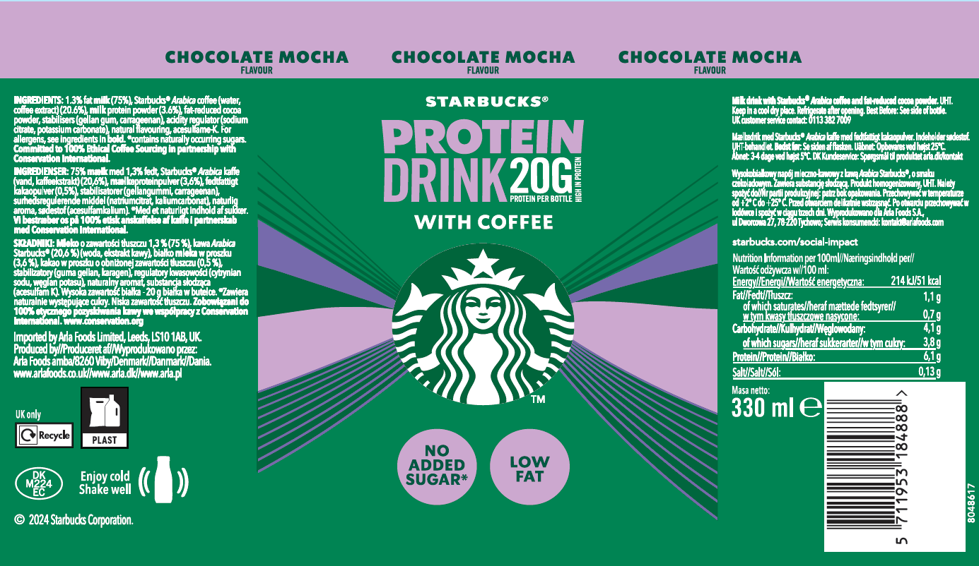 | Krótki opis marketingowy | Zawierające 20g białka starbucks® protein mocha to unikalne połączenie naszej aromatycznej kawy arabica starbucks, rozpływającej się czekolady oraz kremowego mleka o niskiej zawartości tłuszczów, bez dodatku cukrów*. |