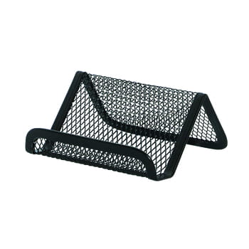 Stojak na wizytówki z metalowej siateczki powlekanej lakierem, wymiary: 95x75x45mm, kolor czarny.
