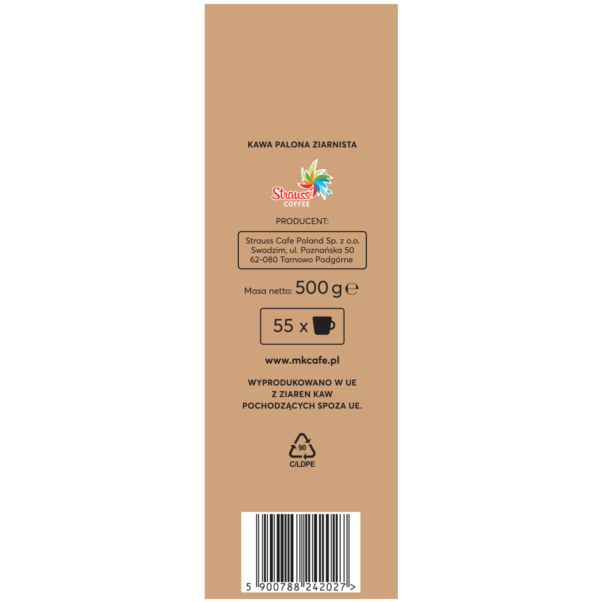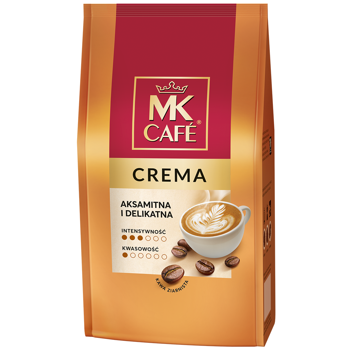 MK Cafe Crema to świetnie zbilansowana mieszanka ziaren południowo-amerykańskiej arabiki z azjatycką robustyą. Właśnie domieszka łagodnych indyjskich rob ust nadaje mieszance aksamitne body i delikatną goryczkę. Specjalny proces palenia zapewnia delikatny smak oraz odpowiedni poziom kwaskowości, wydobywa też przyjemne aromaty z nutami orzechowo-miodowymi. Obecność robusty gwarantuje jedwabistą cremę. Jest to kawa średnoio palona. Aby poznać tajniki pracy baristy wejdź na www.mkcafe.pl