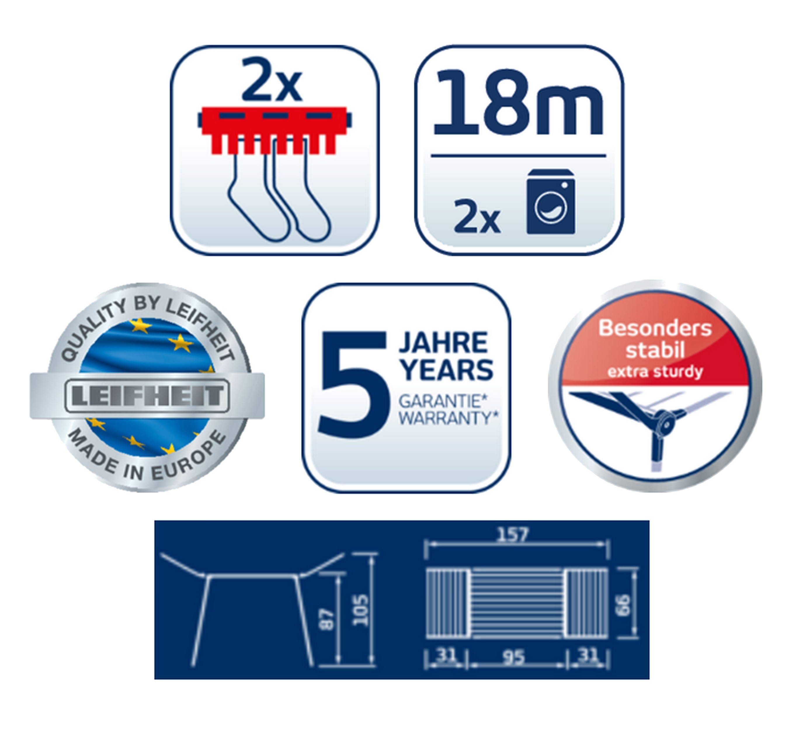 - stabilna i odporna na warunki atmosferyczne - duża powierzchnia suszenia i miejsce na 2 wsady pralki - 2 uchwyty na drobną garderobę - wygodne suszenie większych rzeczy - 5-letnia gwarancja