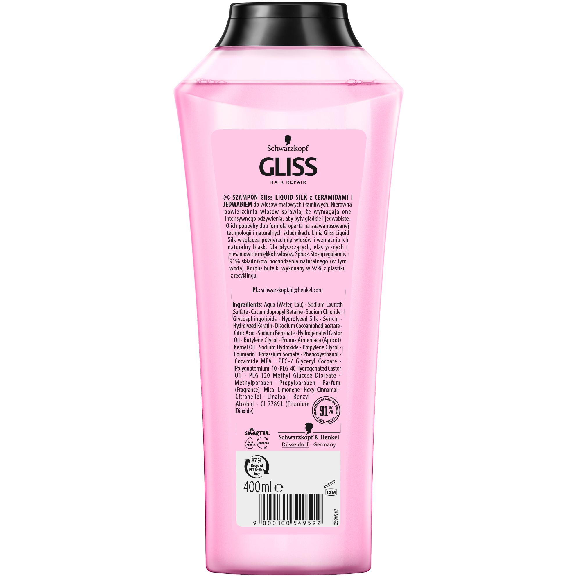 | Skład | Aqua (water, eau), sodium laureth sulfate, cocamidopropyl betaine, sodium chloride, glycosphingolipids, hydrolyzed silk, sericin, hydrolyzed keratin, disodium cocoamphodiacetate, citric acid, sodium benzoate, hydrogenated castor oil, butylene glycol, prunus armeniaca (apricot) kernel oil, sodium hydroxide, propylene glycol, coumarin, potassium sorbate, phenoxyethanol, cocamide mea, peg-7 glyceryl cocoate, polyquaternium-10, peg-40 hydrogenated castor oil, peg-120 methyl glucose dioleate, methylparaben, propylparaben, parfum (fragrance), mica, limonene, hexyl cinnamal, citronellol, linalool, benzyl alcohol, ci 77891 (titanium dioxide |