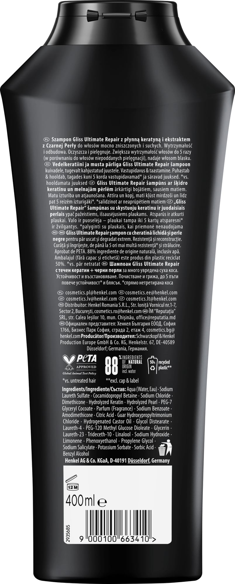 | Skład | Aqua (water, eau), sodium laureth sulfate, cocamidopropyl betaine, sodium chloride, peg-7 glyceryl cocoate, hydrolyzed keratin, hydrolyzed pearl, disodium cocoamphodiacetate, sodium benzoate, guar hydroxypropyltrimonium chloride, hydrogenated castor oil, glycerin, simmondsia chinensis (jojoba) seed oil, sodium hydroxide, citric acid, dimethicone, propylene glycol, sorbic acid, potassium sorbate, salicylic acid, phenoxyethanol, peg-40 hydrogenated castor oil, cocamide mea, peg-120 methyl glucose dioleate, laureth-23, laureth-4, parfum (fragrance), mica, linalool, limonene, benzyl salicylate, benzyl alcohol, ci 77891 (titanium dioxide) |