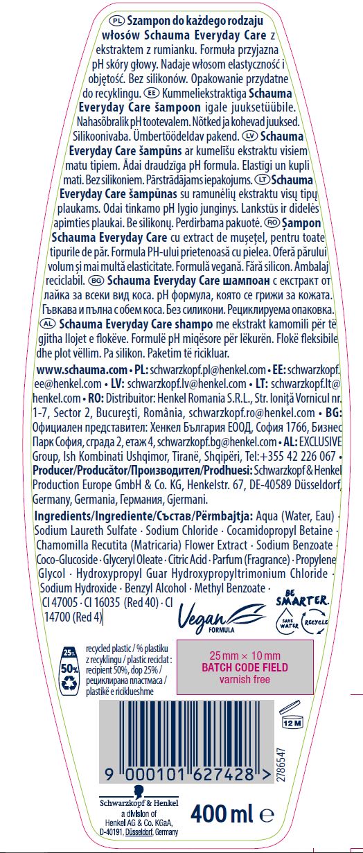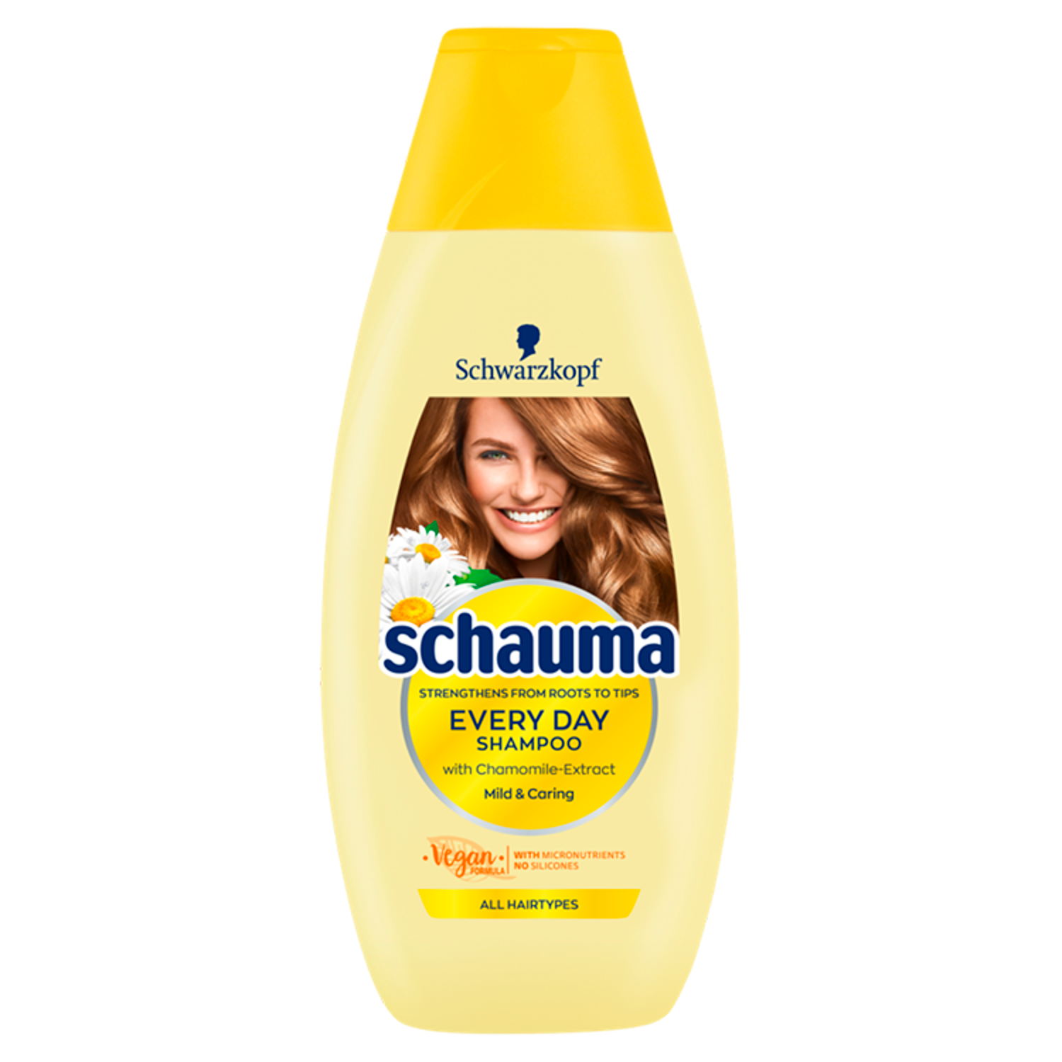 SZAMPON Schauma z ekstraktem z rumianku do wszystkich rodzajów włosów. Do codziennego stosowania. Wzmocnienie struktury włosów dla ich większej elastyczności i objętośći.