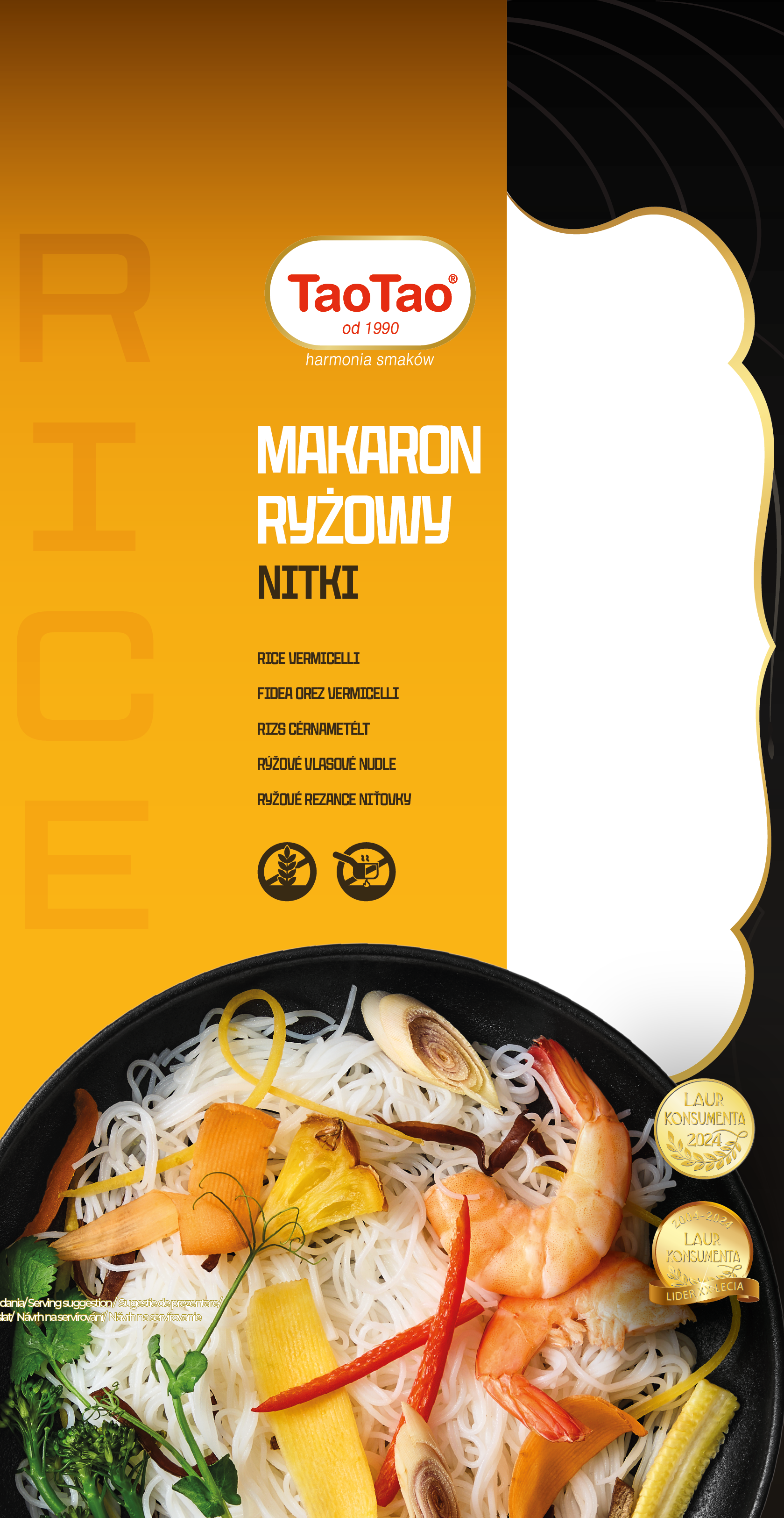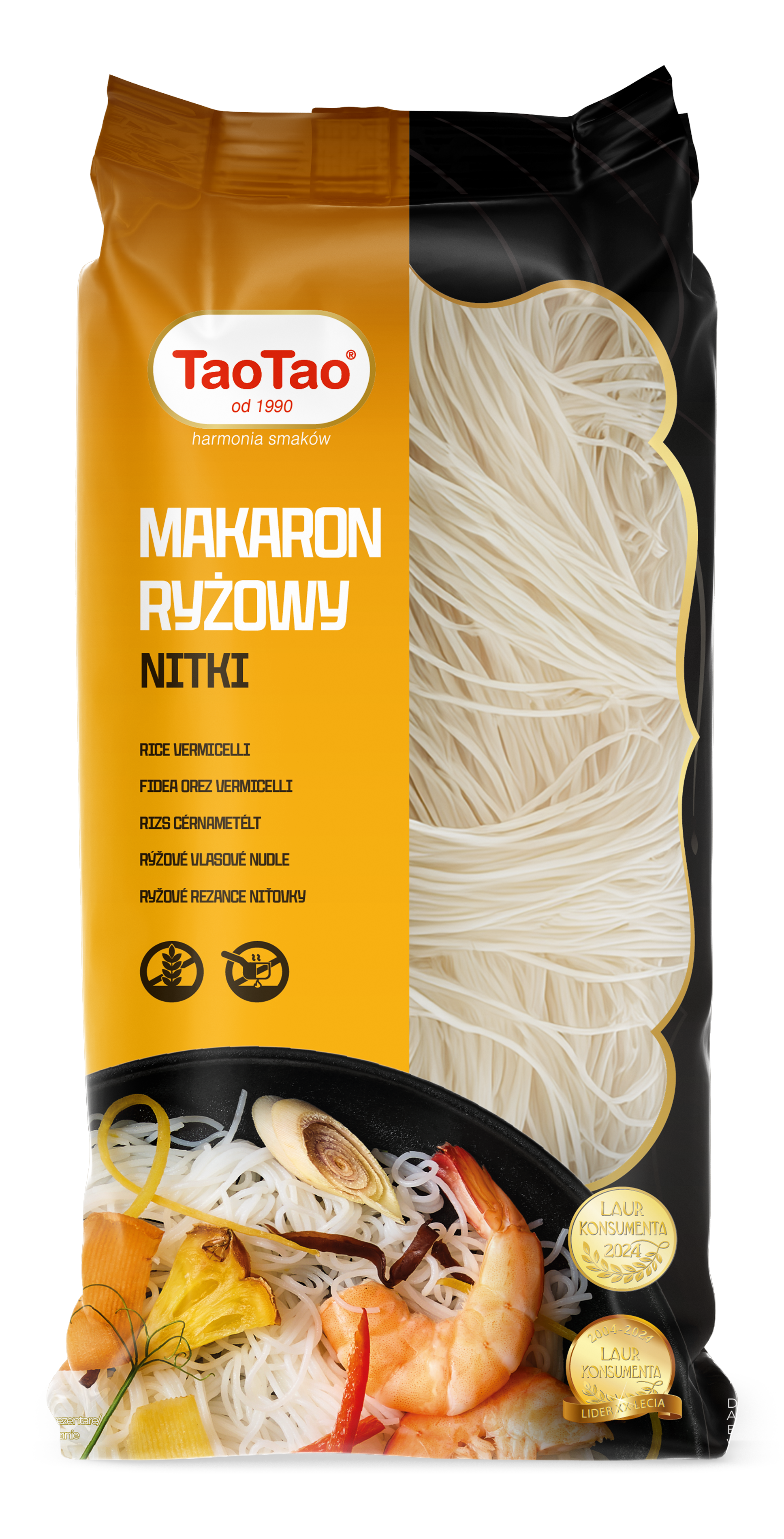 Makaron ryżowy nitki TaoTao ma postać cieniutkich, półprzezroczystych nitek. Produkowany jest wyłącznie z mąki i wody, nie zawiera cholesterolu.