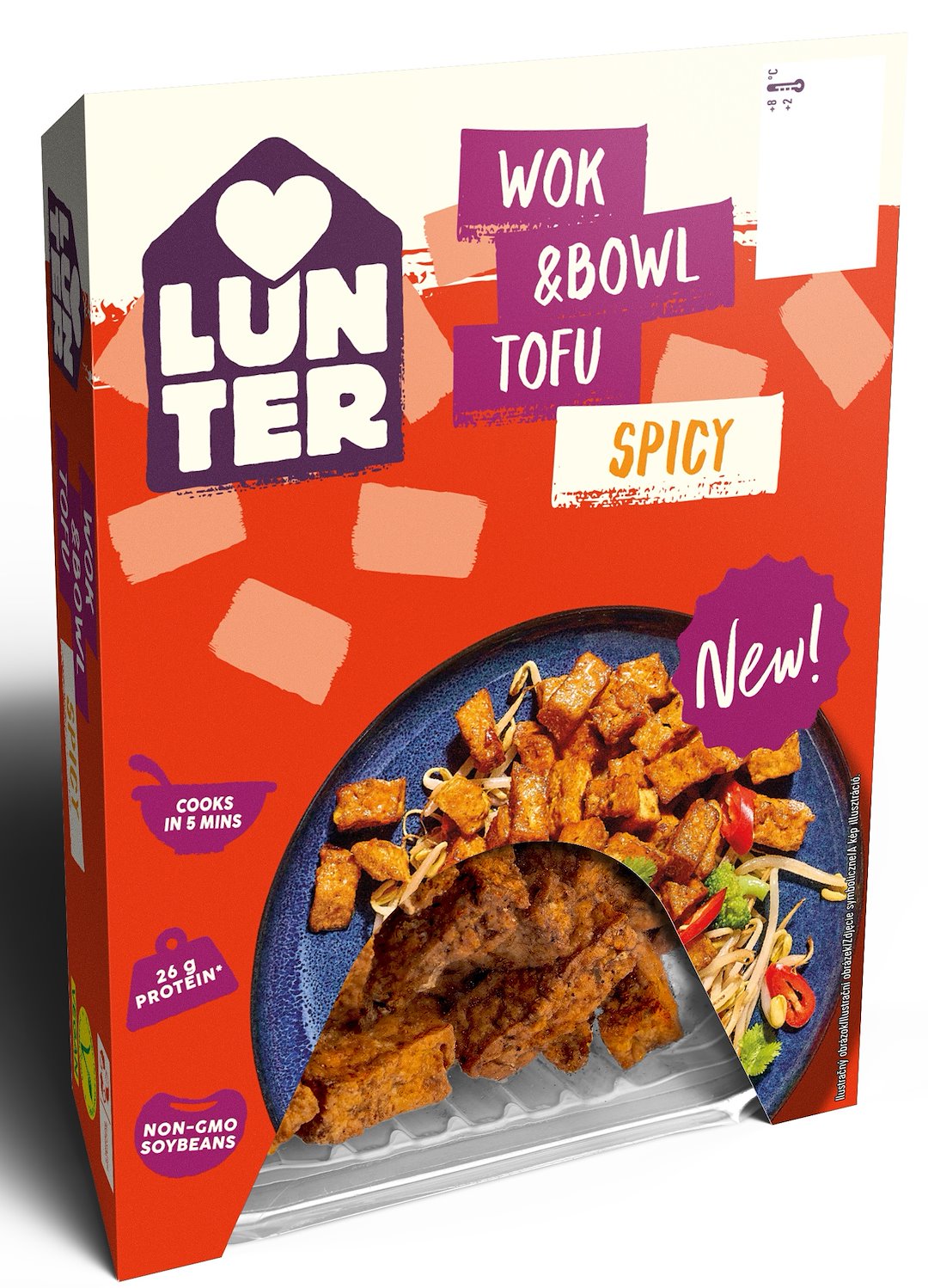 Masz ochotę na odrobinę pikanterii? Marynowane kawałki tofu o delikatnie ostrym smaku z naszej nowej linii Lunter Ready to Cook pozwolą Ci przygotować pełnowartościowy posiłek w zaledwie 5 minut! Bez stresu, bez długich przygotowań – tylko smaczne i zdrowe jedzenie. Idealne do dań azjatyckich, wrapów, sałatek, jako przekąska lub w duecie z ulubionym sosem. Powstaje z połączenia czystego tofu bez GMO i prostej marynaty – bez sztucznych dodatków i zbędnych składników. Jedno opakowanie dostarcza aż 24 g białka, które doda Ci energii na cały dzień!