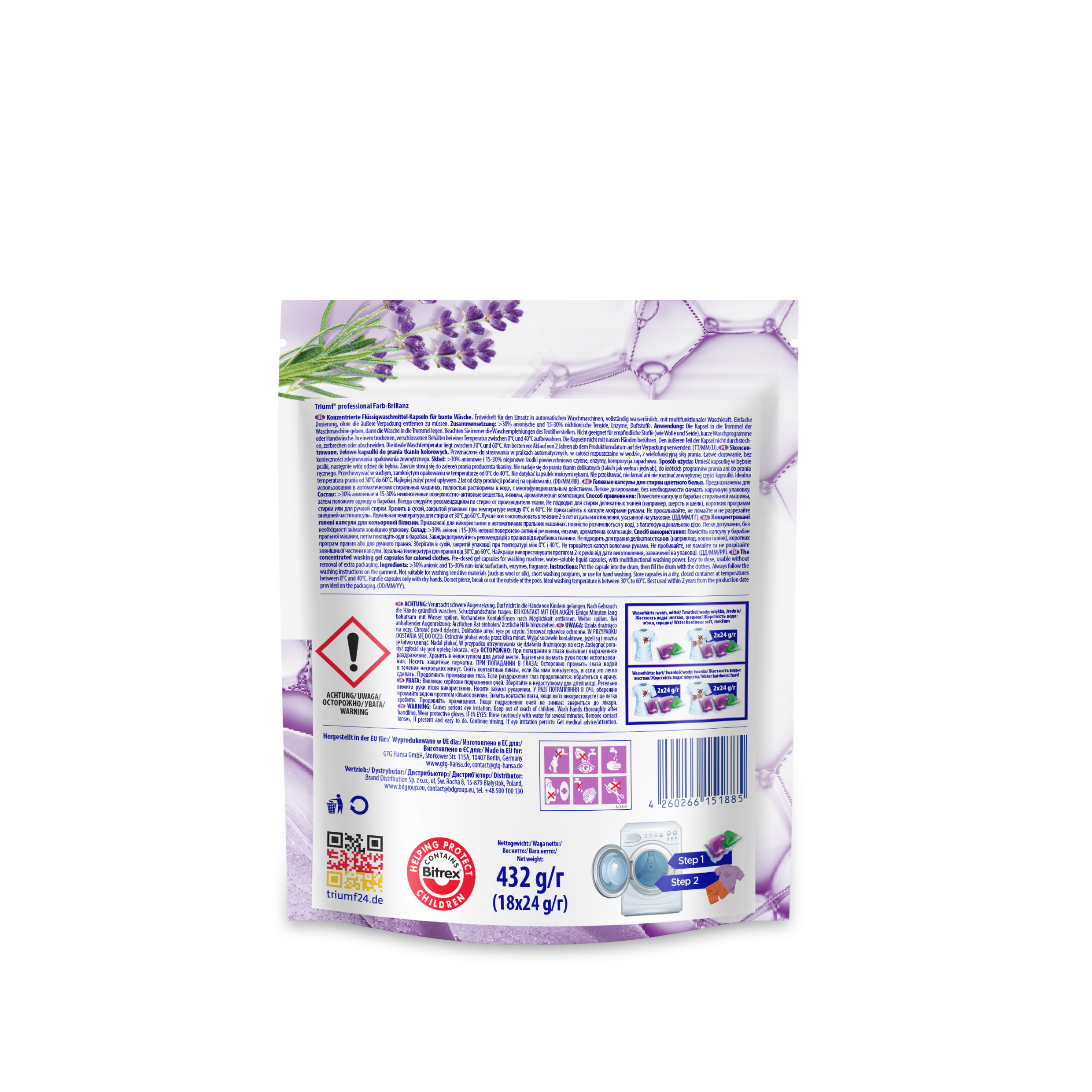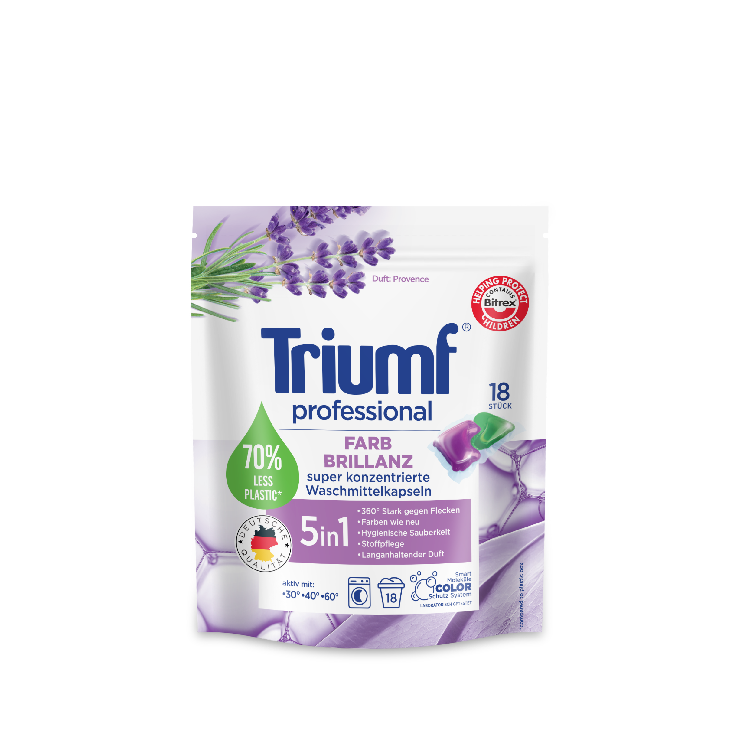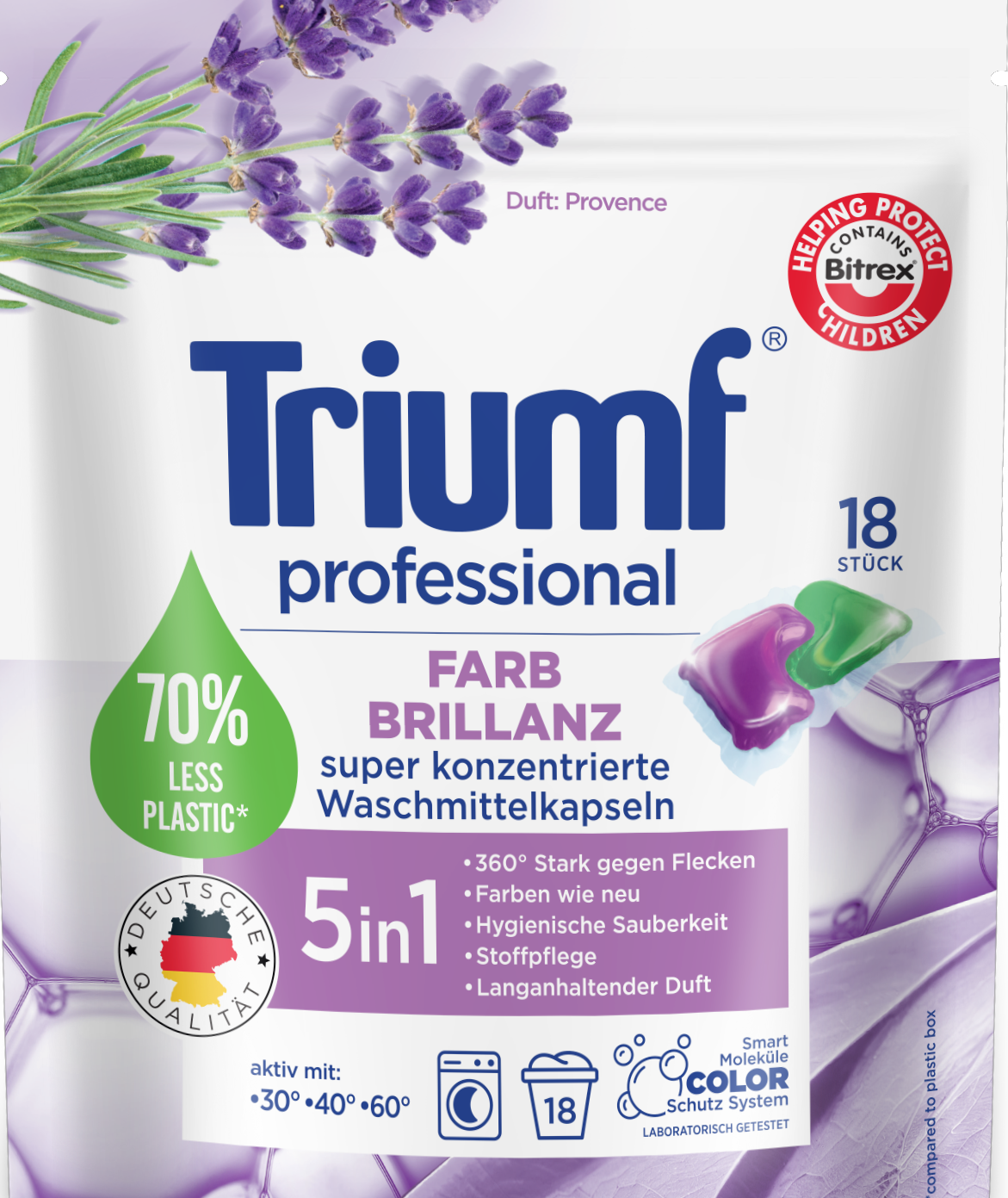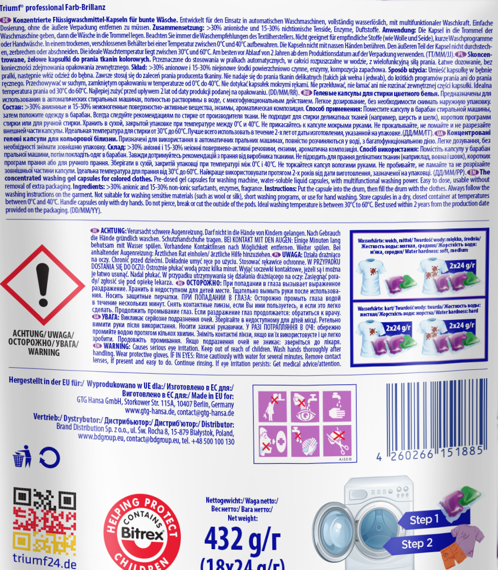 Wysokoskoncentrowane, żelowe 2-fazowe kapsułki do prania Triumf Farb-Brillanz to szybkie i wygodne pranie. Kapsułki nadają się do prania w pralkach automatycznych, w temperaturze od 30°C do 60°C. Zawierają najbardziej gorzką substancję Bitrex, która uniemożliwia połknięcie produktu. Bezpieczne dla środowiska, ponieważ nie zawierają fosforanów i zeolitów. Specjalnie opracowana kompozycja składników aktywnych i enzymów gwarantuje skuteczne usuwanie plam oraz utrzymanie żywych kolorów przez długi czas. Posiadają nowoczesne opakowania typu doypack, które pozwalają na obniżenie udziału plastiku i ograniczenie jego produkcji na co dzień.