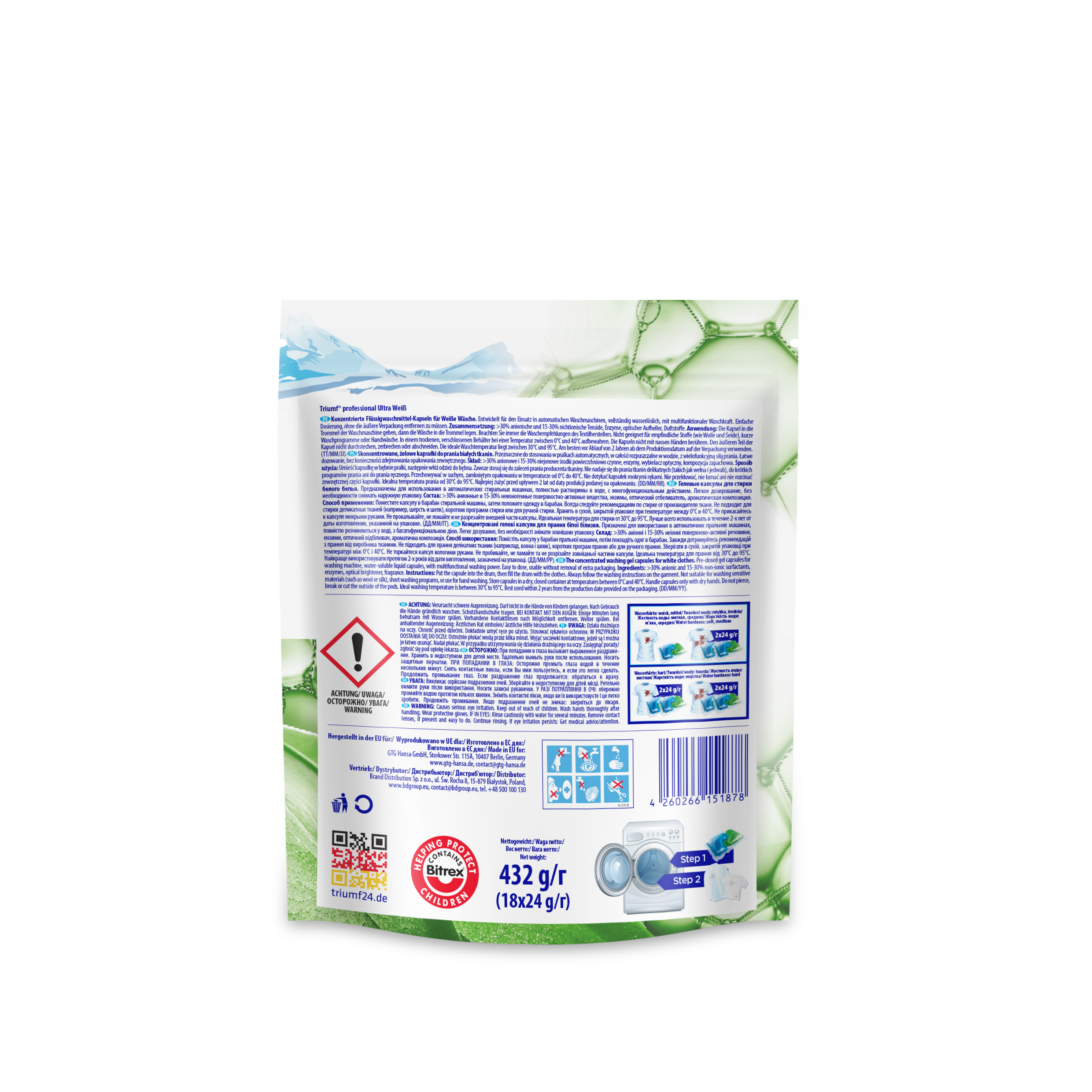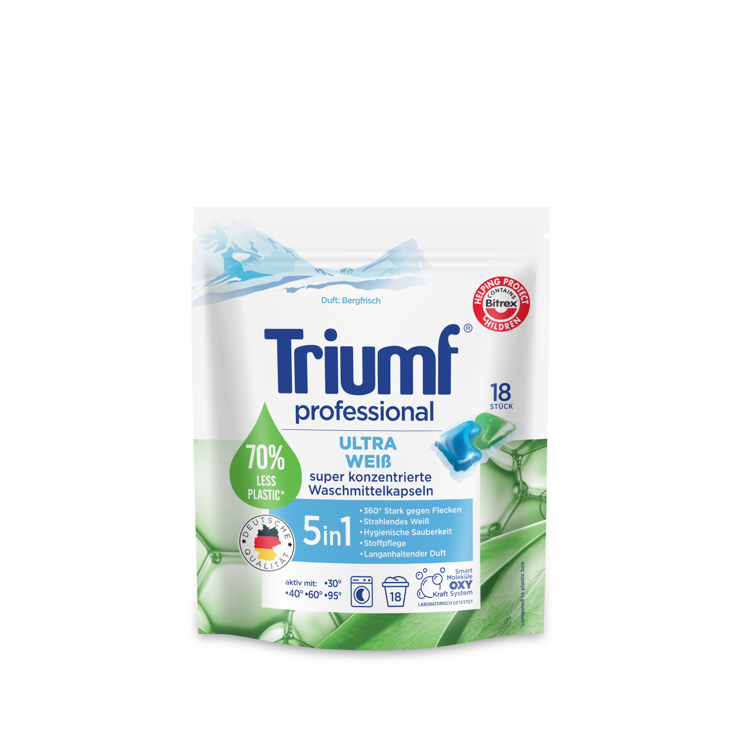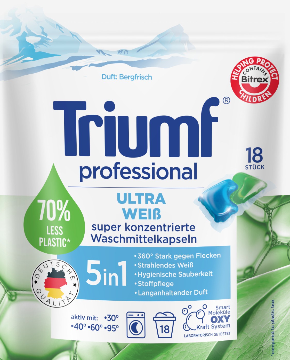 Wysokoskoncentrowane, żelowe 2-fazowe kapsułki do prania Triumf Ultra Weiss to szybkie i wygodne pranie. Kapsułki nadają się do prania w pralkach automatycznych, w temperaturze od 30°C do 60°C. Zawierają najbardziej gorzką substancję Bitrex, która uniemożliwia połknięcie produktu. Bezpieczne dla środowiska, ponieważ nie zawierają fosforanów i zeolitów. Specjalnie opracowana kompozycja składników aktywnych i enzymów gwarantuje skuteczne usuwanie plam oraz utrzymanie żywych kolorów przez długi czas. Posiadają nowoczesne opakowania typu doypack, które pozwalają na obniżenie udziału plastiku i ograniczenie jego produkcji na co dzień.